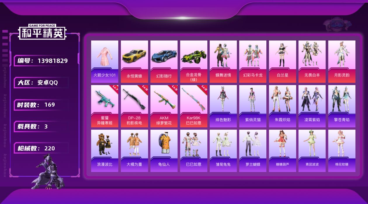 [13981829]可二次【店主推荐捡漏号!可直接换绑】/老101 安卓 手Q-5粉装-4特效枪-3载具-4粉色飞行器-6.9w热力值-14王牌印记-169套装-220枪皮【热门品类】:套装-火箭少女101,套装-龟仙人,套装-浪漫波比【粉色载具】:永恒黄蜂,幻影随行,合金龙骨(绿)【粉色套装】:粉装-蝶舞迷情,粉装-幻彩马卡龙,角色-白兰星,粉装-无畏白羊,角色-月影灵韵【粉色枪皮等级】:AKM-绿萝繁花(五级),蜜獾-异瞳寒姬(七级),Kar98K-巳巳如意(五级),DP-28-豹影疾电(五级)【粉色飞行器】:春暖花开飞行器,超新星飞行器