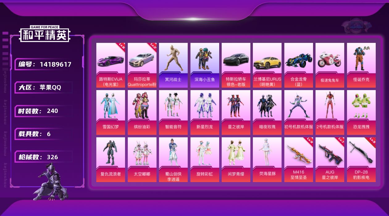 [14189617]【店主推荐捡漏号!可直接换绑】/路特斯EVIJA(电光紫)(六级)/素材身法号/老木乃伊/无敌战神框1/地铁满天赋 /M416-至情至圣(九级) 苹果 手Q-无敌战神框-16粉装-20特效枪-6载具-2粉色飞行器-13w热力值-18王牌印记-240套装-326枪皮【红色载具】:路特斯EVIJA(电光紫)(六级),玛莎拉蒂Quattroporte(幻星粉)(二级)【热门品类】:粉装-怪诞乔克,粉装-雪国幻梦,粉装-缤纷油彩,套装-冥河战士,套装-深海小丑鱼,套装-小丑鱼,角色-军刀雅典娜,套装-龟仙人,套装-暗影哥特,套装-红红火火【粉色载具】:特斯拉Model 3(冷光银),兰博基尼URUS(明艳黄),路特斯EVIJA(电光紫),玛莎拉蒂Quattroporte(幻星粉),合金龙骨(蓝),极速兔兔车【粉色套装】:粉装-怪诞乔克,粉装-雪国幻梦,粉装-智能音符,粉装-缤纷油彩,粉装-新星烈龙,粉装-星之彼岸,粉装-暗夜玫瑰,角色-初号机款机体服,角色-2号机款机体服,粉装-恐龙拽拽,角色-复仇流浪者,粉装-太空嘟嘟,蜀山剑侠-李逍遥,粉装-旋转彩虹,粉装-闲梦青缨,角色-荧海星豚【粉色枪皮等级】:AKM-炫紫旋律(五级),AKM-星际浪客(一级),M16A4-垂柳戏鸭(二级),SCAR-L-梦幻火箭(五级),M416-五爪金龙(二级),M416-风花雪月(一级),M416-暖熊萌萌(一级),M416-至情至圣(九级),GROZA-旋转彩虹(五级),AUG-星之彼岸(七级),M762-激战未来(五级),蜜獾-荧海星豚(五级),UZI-绮梦青鸾(四级),UMP45-雪国精灵(五级),Vector-环太平洋(五级),Kar98K-巳巳如意(五级),Mk14-甜梦熊击(五级),DP-28-豹影疾电(五级)【粉色飞行器】:精灵迷巫飞行器,荒漠赏金飞行翼