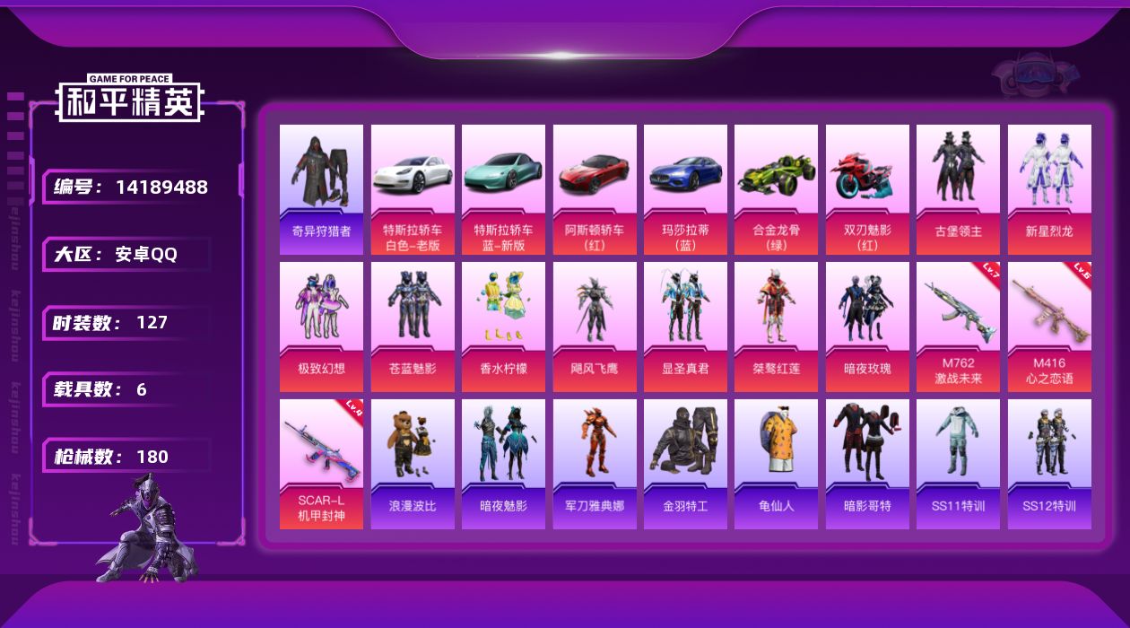 [14189488]可二次【店主推荐捡漏号!可直接换绑】/素材身法号 安卓 手Q-9粉装-3特效枪-6载具-3粉色飞行器-6.3w热力值-10王牌印记-127套装-180枪皮【热门品类】:套装-奇异狩猎者,角色-军刀雅典娜,套装-金羽特工,套装-龟仙人,套装-暗影哥特,套装-浪漫波比【粉色载具】:特斯拉Model 3(珍珠白),特斯拉Roadster(水滴蓝),阿斯顿马丁DBS(红),玛莎拉蒂Ghibli(蓝),合金龙骨(绿),双人摩托-双刃魅影(红)【粉色套装】:粉装-古堡领主,粉装-新星烈龙,粉装-极致幻想,粉装-苍蓝魅影,粉装-香水柠檬,粉装-飓风飞鹰,粉装-显圣真君,粉装-桀骜红莲,粉装-暗夜玫瑰【粉色枪皮等级】:SCAR-L-机甲封神(四级),M416-心之恋语(六级),M762-激战未来(七级)【粉色飞行器】:古堡领主飞行器,潮汐统领飞行器