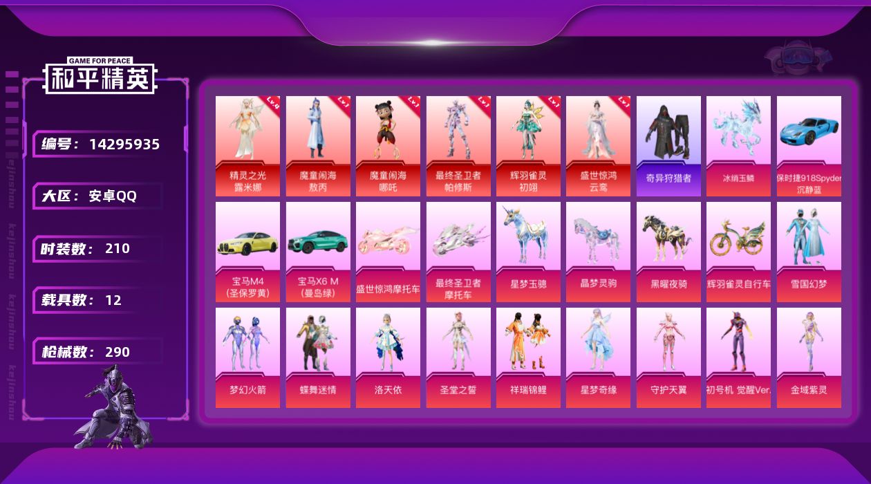 [14295935]可二次【店主推荐捡漏号!可直接换绑】/素材身法号/精灵之光-露米娜(四级) 安卓 手Q-6神装-25粉装-17特效枪-12载具-17粉色飞行器-12w热力值-16王牌印记-210套装-290枪皮【红色神装等级】:魔童闹海-敖丙(一级),魔童闹海-哪吒(一级),最终圣卫者-帕修斯(一级),辉羽雀灵-初翊(一级),盛世惊鸿-云鸾(一级),精灵之光-露米娜(四级)【热门品类】:粉装-雪国幻梦,粉装-梦幻火箭,套装-奇异狩猎者,套装-龟仙人,套装-粉红小猪,角色-8号机,角色-Mark.06【粉色载具】:宝马M4(圣保罗黄),宝马X6 M(曼岛绿),保时捷918 Spyder(沉静蓝),盛世惊鸿摩托车,最终圣卫者摩托车,僚机-萌兔起飞,僚机-冰龙团团,星梦玉骢,晶梦灵驹,黑曜夜骑,冰绡玉鳞,辉羽雀灵自行车【粉色套装】:粉装-雪国幻梦,粉装-蝶舞迷情,粉装-梦幻火箭,角色-洛天依,角色-圣堂之誓,粉装-祥瑞锦鲤,角色-星梦奇缘,角色-守护天翼,角色-初号机 觉醒Ver.,角色-金域紫灵,粉装-金丰海韵,角色-狂花道·不知火舞,角色-玄冥寒域,角色-晶梦幻蝶,角色-彩虹独角兽,角色-樱桃泡泡,角色-翎光蝶翼,角色-天鹅座 冰河,角色-狂魇小丑,角色-宁雨蝶,角色-罗征,角色-绯穹魔姬,角色-奇迹舞步 贝贝,角色-奇迹舞步 美琪,角色-奇迹舞步 美雪【粉色枪皮等级】:SCAR-L-锦绣绵绵(五级),M416-灵猫魔法师(六级),GROZA-精灵之光(三级),M762-鬼刀(一级),UMP45-宇宙意志(三级),Vector-最终圣卫者(一级),P90-金丰海韵(七级),P90-魔童闹海 敖丙(一级),Kar98K-巳巳如意(五级),Mk14-盛世惊鸿(二级),Mk14-爆裂游戏(一级),DP-28-圣堂之誓(六级),DP-28-豹影疾电(五级),MG3-洛神天依(一级),MG3-突变脉冲(六级),MG3-辉羽雀灵(一级),PKM-江南烟雨(五级)【粉色飞行器】:春暖花开飞行器,梦幻火箭飞行器,庄周梦蝶飞行器,镜域双华-灵镜之阶,龙翔九天飞行器,深渊漩涡飞行器,曦光华影飞行器,凤舞九天飞行器,万象金身飞行器,翎光蝶翼飞行器,雀灵庇佑飞行器,终晖之翼飞行器,灵猫魔法师飞行器,飞天猪飞行器,灵珠游龙飞行器
