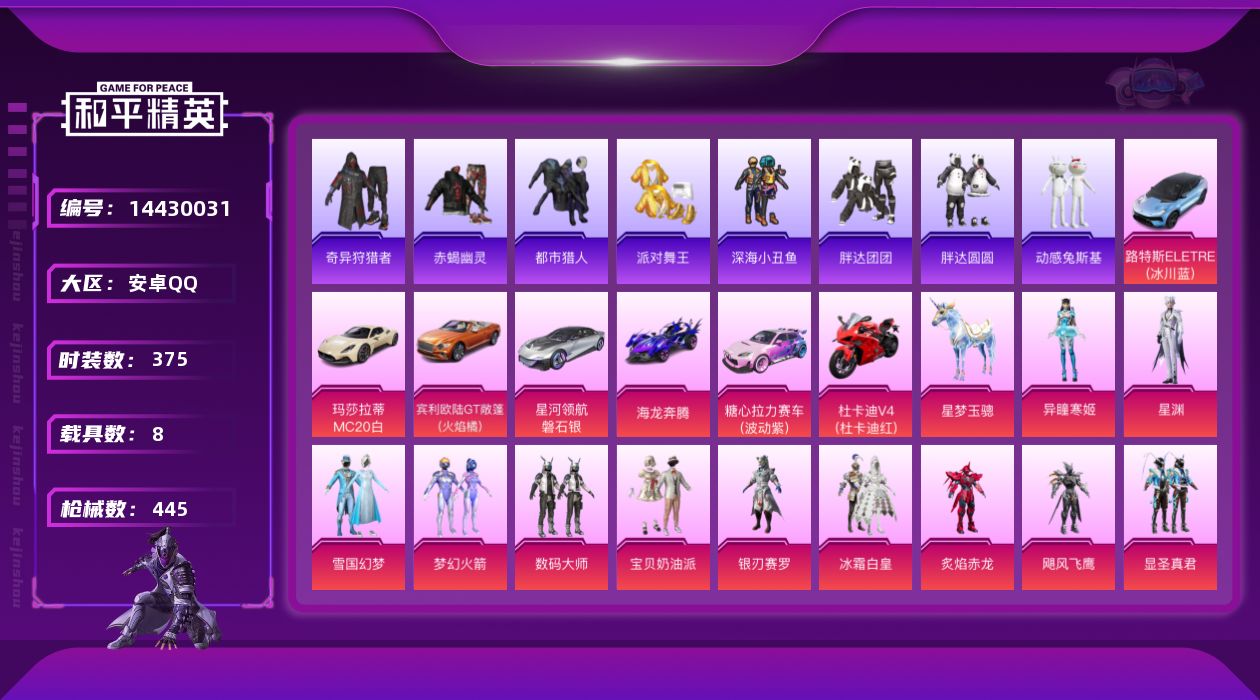 [14430031]【店主推荐捡漏号!可直接换绑】/素材身法号/地铁满天赋 安卓 手Q-29粉装-16特效枪-8载具-8粉色飞行器-17.1W热力值-23王牌印记-375套装-445枪皮【热门品类】:粉装-雪国幻梦,粉装-梦幻火箭,绝对防御上衣,套装-浪漫天命,套装-赤蝎幽灵,套装-都市猎人,套装-派对舞王,套装-深海小丑鱼,套装-小丑鱼,套装-奇异狩猎者,角色-军刀雅典娜,套装-胖达团团,套装-胖达圆圆,套装-金羽特工,套装-暗夜行者,套装-动感兔斯基人偶服,套装-龟仙人,套装-潮萌小黄鸭,套装-暗影哥特,套装-浪漫波比,套装-粉红小猪,角色-Mark.06,熔岩游骑兵连帽夹克,套装-红熊茄茄【粉色载具】:路特斯ELETRE(冰川蓝),玛莎拉蒂MC20(星石白),宾利欧陆GT敞篷(火焰橘),星河领航(磐石银),海龙奔腾,糖心拉力赛车(波动紫),杜卡迪 Panigale V4(杜卡迪红),星梦玉骢【粉色套装】:粉装-数码大师,粉装-宝贝奶油派,粉装-雪国幻梦,粉装-梦幻火箭,粉装-银刃赛罗,粉装-冰霜白皇,粉装-炙焰赤龙,粉装-飓风飞鹰,粉装-显圣真君,角色-洛天依,角色-2号机款机体服,角色-复仇流浪者,粉装-傲雪凌霜,粉装-霁雪冰心,粉装-灵感创作师,粉装-旋转彩虹,粉装-冰川红玫,粉装-桃夭倾城,粉装-霞光圣骑,粉装-第五大道,角色-小可学妹,角色-圣堂之誓,角色-守护天翼,角色-初号机 觉醒Ver.,角色-千金淑猫,角色-荧海星豚,角色-奇迹舞步 美琪,角色-星渊,角色-异瞳寒姬【粉色枪皮等级】:AKM-梦之光华(七级),M16A4-垂柳戏鸭(五级),SCAR-L-童趣迷兔(七级),M416-五爪金龙(五级),GROZA-镜光银凌(五级),AUG-暖羊咩咩(五级),M762-青锋波束(五级),蜜獾-辉耀战甲(七级),UMP45-量子极限(五级),UMP45-宇宙意志(三级),汤姆逊-热量炸弹(五级),Kar98K-巳巳如意(五级),AWM-橘柚倾心(五级),Mk14-甜梦熊击(五级),M417-第五大道(五级),DP-28-豹影疾电(五级)【粉色飞行器】:冰川粉黛飞行器,镜域双华-灵镜之阶,霓虹漫游飞行器,深渊漩涡飞行器,曦光华影飞行器,脆鲨七海飞行器,极意拳锋飞行器