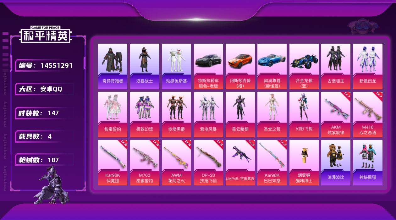 [14551291]可二次【店主推荐捡漏号!可直接换绑】/素材身法号 安卓 手Q-9粉装-9特效枪-4载具-5粉色飞行器-7.2w热力值-7王牌印记-147套装-187枪皮【热门品类】:套装-奇异狩猎者,套装-金羽特工,套装-浪客战士,套装-动感兔斯基人偶服,角色-忠真马岱,套装-龟仙人,套装-浪漫波比,套装-粉红小猪,角色-Mark.06,撬棍-龙胆亮银枪【粉色载具】:特斯拉Model 3(冷光银),阿斯顿马丁DBX(橙),幽澜尊爵(静谧蓝),合金龙骨(蓝)【粉色套装】:粉装-古堡领主,粉装-新星烈龙,粉装-甜蜜誓约,粉装-极致幻想,粉装-赤焰黑爵,粉装-紫电风暴,角色-星云暗核,角色-圣堂之誓,粉装-幻影飞狐【粉色枪皮等级】:AKM-炫紫旋律(七级),M416-心之恋语(七级),M762-甜蜜誓约(五级),UMP45-宇宙意志(三级),Kar98K-伏魔团(六级),Kar98K-巳巳如意(三级),AWM-花间之火(五级),DP-28-扶摇飞仙(四级)【粉色飞行器】:炫紫旋律飞行器,伏魔团飞行器,甜蜜誓约飞行器,深渊漩涡飞行器