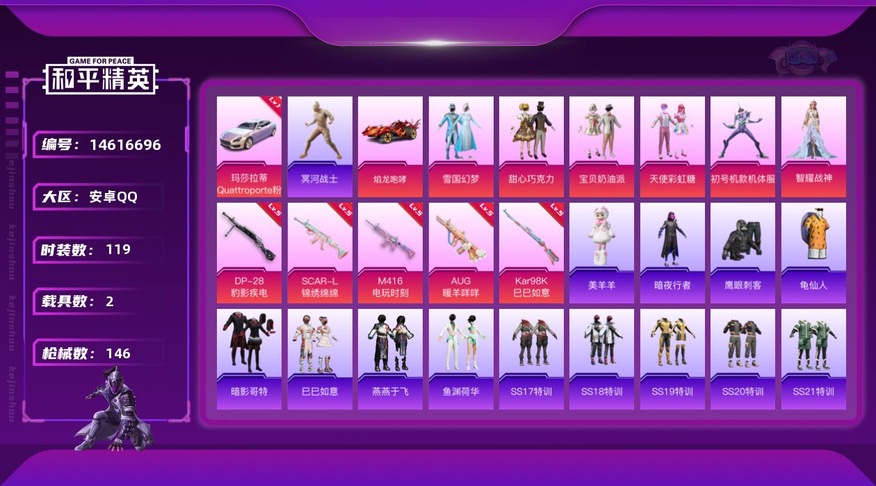 [14616696]可二次【店主推荐捡漏号!可直接换绑】/素材身法号/老木乃伊/地铁满天赋 安卓 手Q-6粉装-5特效枪-2载具-1粉色飞行器-4.5w热力值-18王牌印记-119套装-146枪皮【红色载具】:玛莎拉蒂Quattroporte(幻星粉)(一级)【热门品类】:粉装-雪国幻梦,套装-冥河战士,套装-暗夜行者,套装-龟仙人,套装-暗影哥特【粉色载具】:玛莎拉蒂Quattroporte(幻星粉),焰龙咆哮【粉色套装】:粉装-甜心巧克力,粉装-宝贝奶油派,粉装-天使彩虹糖,粉装-雪国幻梦,角色-初号机款机体服,角色-智耀战神【粉色枪皮等级】:SCAR-L-锦绣绵绵(五级),M416-电玩时刻(五级),AUG-暖羊咩咩(五级),Kar98K-巳巳如意(五级),DP-28-豹影疾电(五级)