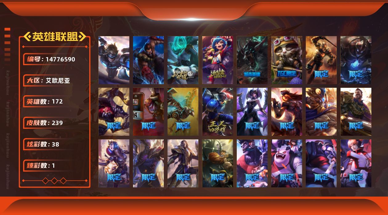 铂金段位-172英雄-239皮肤-38炫彩-2终极-2神话-37限定-17传说-75史诗
