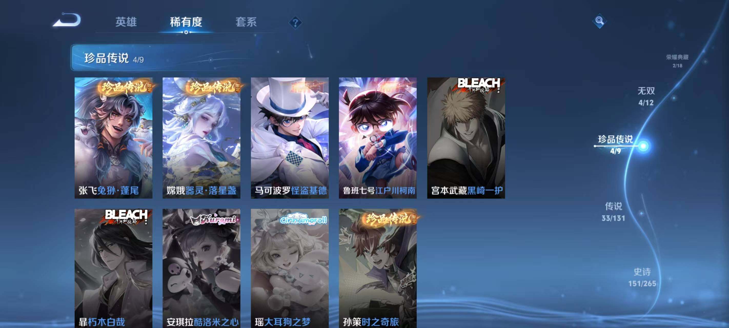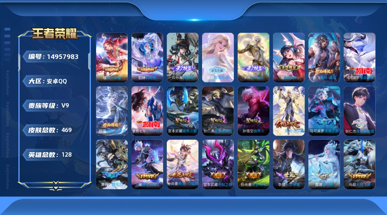 - [11296012]V8 1典藏 1珍品传说 16传说 123英雄 215皮肤 可修改实名 优质装备:鸣剑·曳影,江户川柯南,黄金射手座,冠军飞将,猫影幻舞,末日机甲-孙尚香(绿蚂蚱),地狱之眼,胖达荣荣,超时空战士-狄仁杰,妄想实况,黄金天蝎座 传说皮:乘龙·淬吴钩(孙策年限) 珍宝阁皮:胡桃夹子,万物之道 限定皮:愿照·九州拓(澜年限),逐霄战戟,鸣野蒿,至尊宝,傲雪梅枪,遇见飞天,诗剑行,齐天大圣,降魔,五谷丰年,冰锋战神,岱宗(典韦年限),引擎之心,玉兔公主,深海之息(深海大菠萝),山海·玄木吟(马可年限) 史诗皮:器灵·浮梦炉,狼魂孤将,星界战将,茶境仙,海诺心动手记,蒙犽顽岩魄,怒海争锋,蔬乡物语(鲁班七号),遇见神鹿,黄金分割率,特工魅影,千年之狐,电玩·爆裂旋风,江河有灵,高渐离燃音魔法,蒙恬荣光圣徽,偶像歌手,暗夜猫娘,末日机甲-吕布,节奏热浪,女仆咖啡,水果甜心,天才门将,星夜王子,心灵骇客,功夫厨神,暗隐猎兽者,鬼剑武藏,心灵战警,舞动绿茵,地狱岩魂,纤云弄巧,缤纷独角兽,乘风破浪,逐浪之夏,月团寄思,水晶猎龙者,曙光守护者,箭羽风息,金属风暴,原初追逐者,圣诞狂欢,圣诞恋歌,鹰眼统帅,暗夜贵公子,无心,未来纪元-赵云