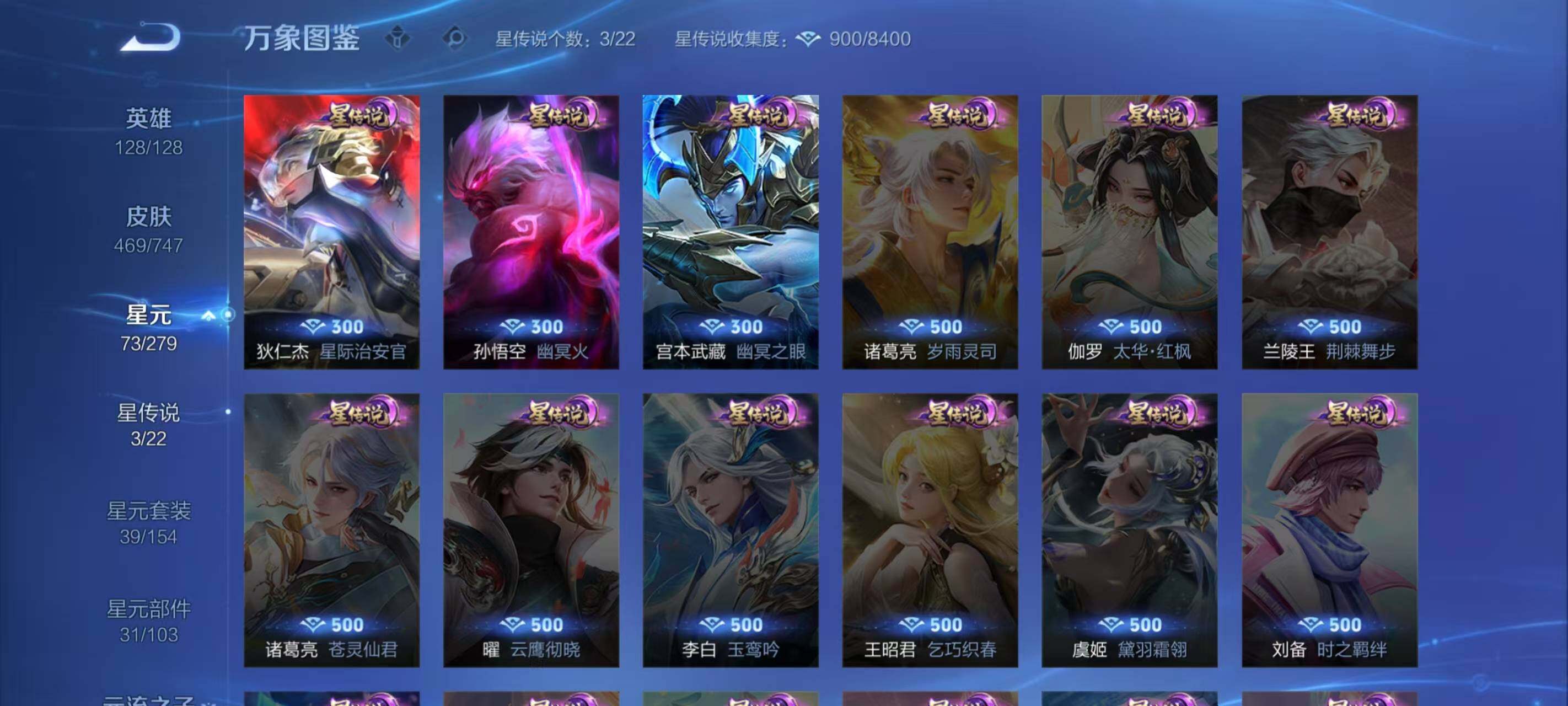 伽罗箭羽风息,李元芳逐浪之夏,公孙离无限星赏官,大乔猫狗日记,孙策猫狗日记,阿轲节奏热浪,露娜紫霞仙子,诸葛亮黄金分割率,王昭君偶像歌手,韩信白龙吟,项羽苍穹之光,孙尚香时之恋人,阿轲暗夜猫娘,雅典娜冰冠公主,吕布末日机甲,鲁班七号电玩小子,橘右京修罗,墨子龙骑士,嬴政摇滚巨星,刘禅绅士熊喵,刘禅天才门将,白起星夜王子,安琪拉心灵骇客,程咬金功夫厨神,刘邦德古拉伯爵,兰陵王暗隐猎兽者,曹操幽灵船长,宫本武藏鬼剑武藏,亚瑟心灵战警,杨戬天秀·启明,蔡文姬舞动绿茵,廉颇地狱岩魂,西施诗语江南,小乔缤纷独角兽,夏侯惇乘风破浪,花木兰水晶猎龙者,铠曙光守护者,墨子金属风暴,百里玄策原初追逐者,吕布圣诞狂欢,貂蝉圣诞恋歌,百里守约特工魅影,嬴政暗夜贵公子,嫦娥拒霜思,雅典娜黎明之约,李白千年之狐,哪吒雪上飞焰,夏洛特永昼,张良千筹问战,弈星滕王阁序,刘禅电玩·爆裂旋风,李元芳匿光侦查者,蒙犽百解令,高渐离燃音魔法,伽罗琥珀纪元,关羽决胜骁骑,李白谪仙醉月,白起苍鳞隐世,赵怀真器灵·浮梦炉,狄仁杰绮世丹青