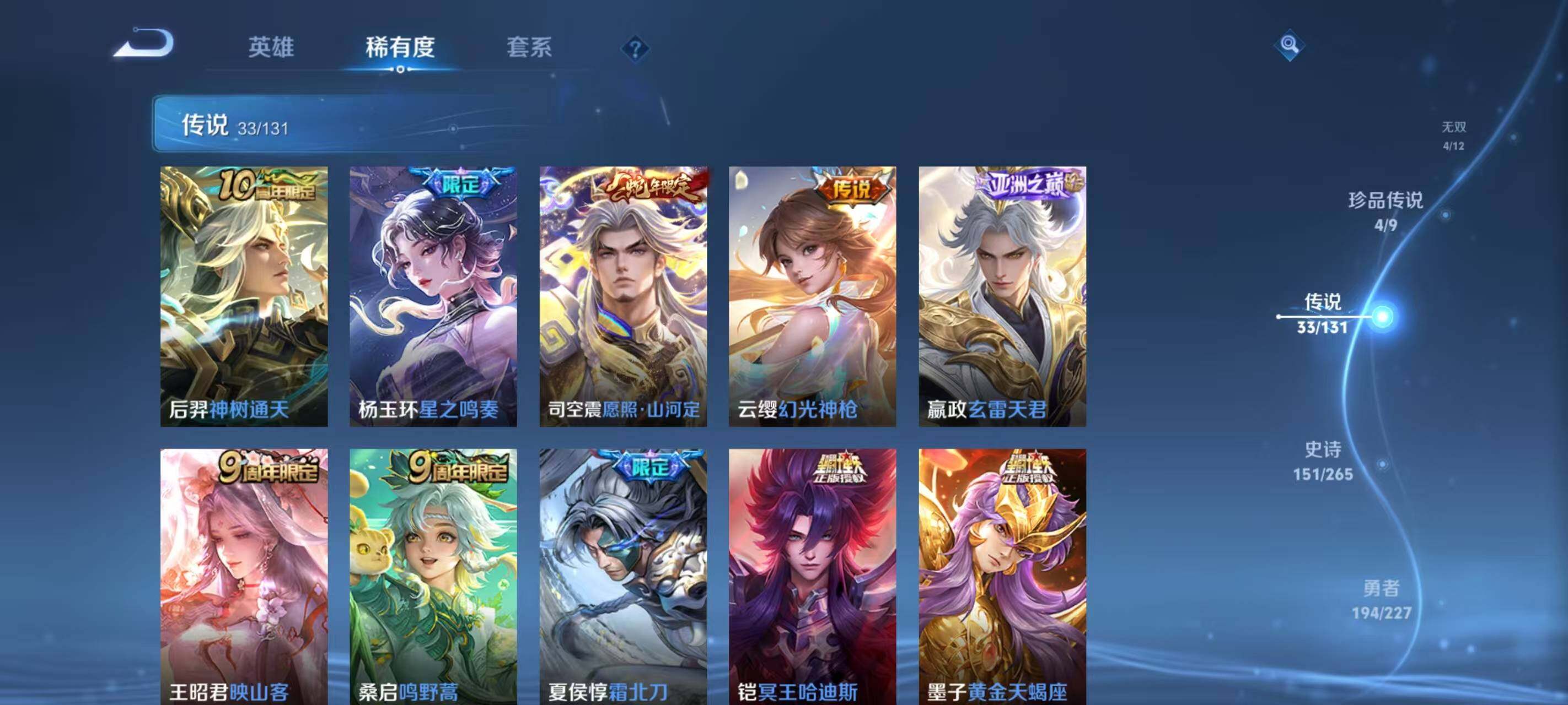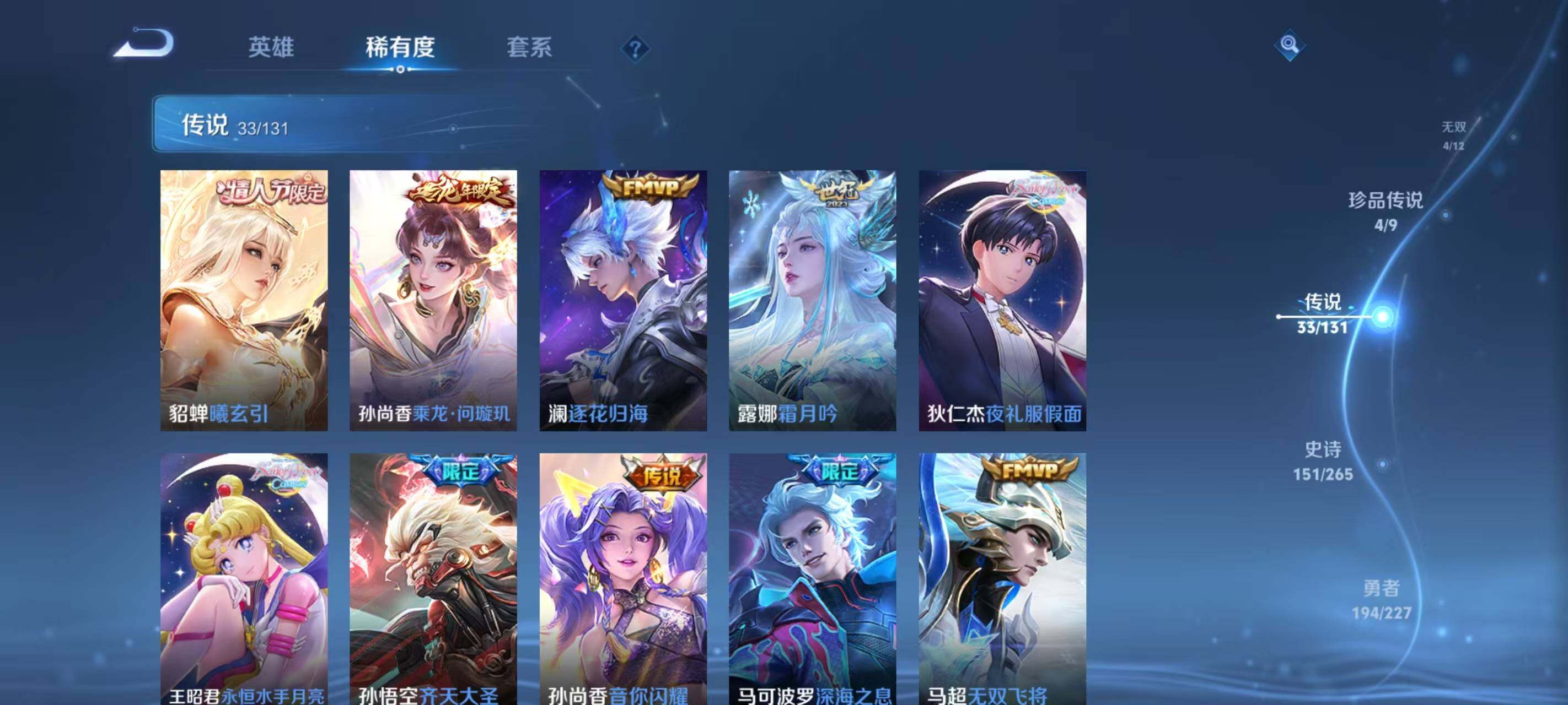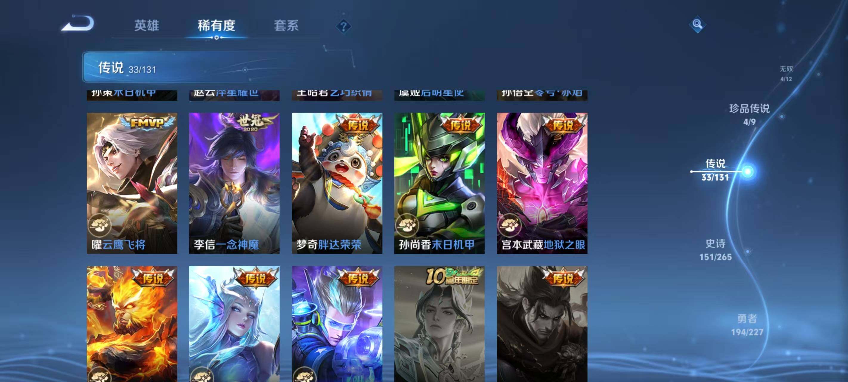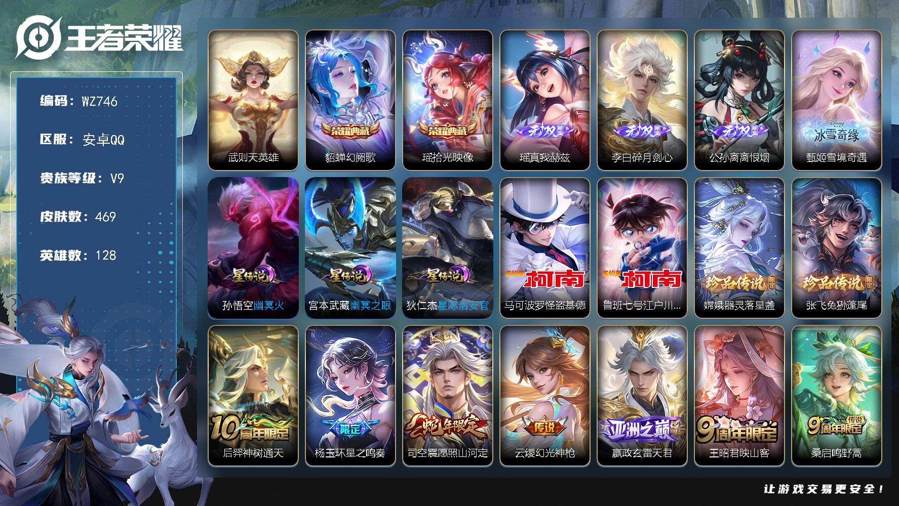 - [12252201]V9 18传说 110英雄 149皮肤 典藏英雄武则天 可修改实名 所有场景社交限制 优质装备:冠军飞将,云鹰飞将(小将军),猫影幻舞,久胜战神,炽阳神光,一念神魔,云霓雀翎,地狱火,仲夏夜之梦(大飞蛾),零号·赤焰,海洋之心,地狱之眼,音你心动-周瑜 珍宝阁皮:优雅恋人 限定皮:白晶晶,时雨天司(水龙头),五谷丰年,武圣,御风骁将(吕布年限),奔雷神使(牛魔年限),祈雪灵祝(雪兔子),李小龙,朱雀志(守约年限),默契交锋-兰陵王,默契交锋-花木兰,大圣娶亲,蜜橘之夏 史诗皮:遇见神鹿,苍穹之光,电玩小子(小书包),白龙吟,黄金分割率,特工魅影,千年之狐,魅语,无限星赏官,冰冠公主,青蛇,偶像歌手,白蛇,晚萤,猫狗日记-孙策,猫狗日记-大乔,时之恋人-孙尚香,修罗,女仆咖啡,星夜王子,心灵骇客,纤云弄巧,繁星吟游(呼啦呼啦),圣诞恋歌,鹰眼统帅,魅力维加斯,无心