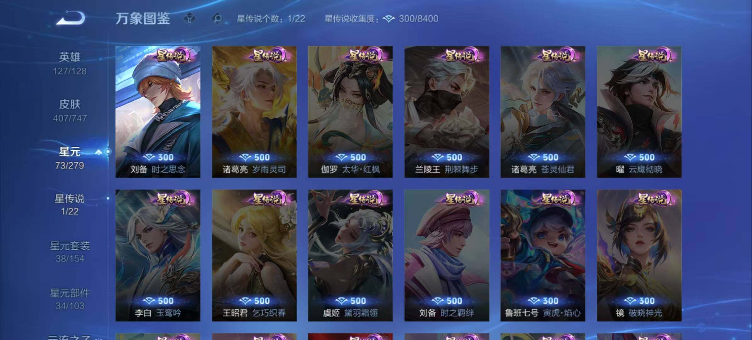 【限定皮肤】:蒙犽顽岩魄,姜子牙天穹之誓,杨戬破阵退雄兵,狄仁杰阴阳师,赵云皇家上将,赵云龙胆,墨子神迹守卫,孙尚香蔷薇恋人,鲁班七号狮舞东方,庄周云端筑梦师,庄周高山流水,阿轲迷踪丽影,钟无艳超时空战士,扁鹊奇幻香踪,周瑜赤莲之焰,元歌云间偶戏,元歌无心,夏侯惇朔风刀,甄姬游园惊梦,甄姬落雪兰心,马可波罗暗影游猎,马可波罗山海玄木吟,狄仁杰魔术师,狄仁杰万华元夜,达摩沙漠行僧,项羽海滩派对,老夫子醍醐杖,老夫子航海奇遇记,关羽冰锋战神,程咬金演武夺筹,刘邦夺宝奇兵,韩信逐梦之影,韩信飞衡,王昭君午后时光,兰陵王驯魔猎人,兰陵王金庭之子,花木兰燃星之曲,娜可露露前尘镜,亚瑟潮玩骑士王,孙悟空至尊宝,后羿如梦令,后羿圣弓游侠,李元芳银河之约,李元芳匿光侦查者,李元芳云中旅人,虞姬启明星使,钟馗神迹守卫,钟馗驱傩正仪,杨玉环遇见飞天,杨戬潮玩骑兵,干将莫邪真爱魔法,干将莫邪画中仙,雅典娜黎明之约,蔡文姬繁星吟游,太乙真人华丽摇滚,鬼谷子原初探秘者,鬼谷子五谷丰年,诸葛亮鹤羽星尊,苏烈千军破阵,百里玄策原初追逐者,百里守约朱雀志,弈星混沌棋,梦奇顽趣,沈梦溪星空之诺,沈梦溪大漠名商,明世隐疑决卦,裴擒虎天狼狩猎者,裴擒虎李小龙,裴擒虎寅虎赤拳,裴擒虎擒涛扼浪,狂铁电玩高手,米莱狄胡桃异想国,云中君纤云弄巧,伽罗天狼溯光者,盾山御銮,猪八戒西部大镖客,上官婉儿梁祝,嫦娥拒霜思,嫦娥暖冬兔眠,曜山海苍雷引,西施玲珑珍味,蒙犽狂想玩偶喵,鲁班大师探海日志,桑启海盐诗旅,夏洛特浮生妄,暃星界游侠,戈娅驭风魔法