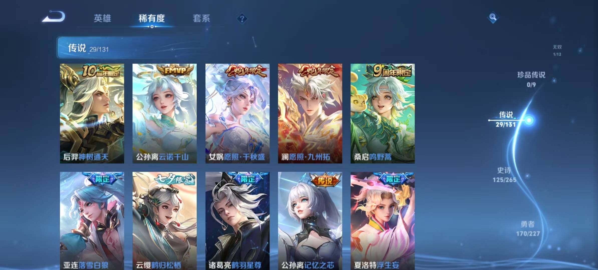 【传说皮肤】:后羿神树通天,公孙离云诺千山,女娲愿照千秋盛,澜愿照九州拓,桑启鸣野蒿,亚连落雪白狼,云缨鹤归松栖,诸葛亮鹤羽星尊,公孙离记忆之芯,夏洛特浮生妄,干将莫邪画中仙,花木兰燃星之曲,曜山海苍雷引,李白诗剑行,百里守约碎云,娜可露露前尘镜,马超无双飞将,裴擒虎寅虎赤拳,王昭君乞巧织情,镜炽阳神光,虞姬启明星使,曜云鹰飞将,李信一念神魔,刘备时之恋人,貂蝉猫影幻舞,张良黄金白羊座,干将莫邪久胜战神,达摩黄金狮子座,梦奇胖达荣荣