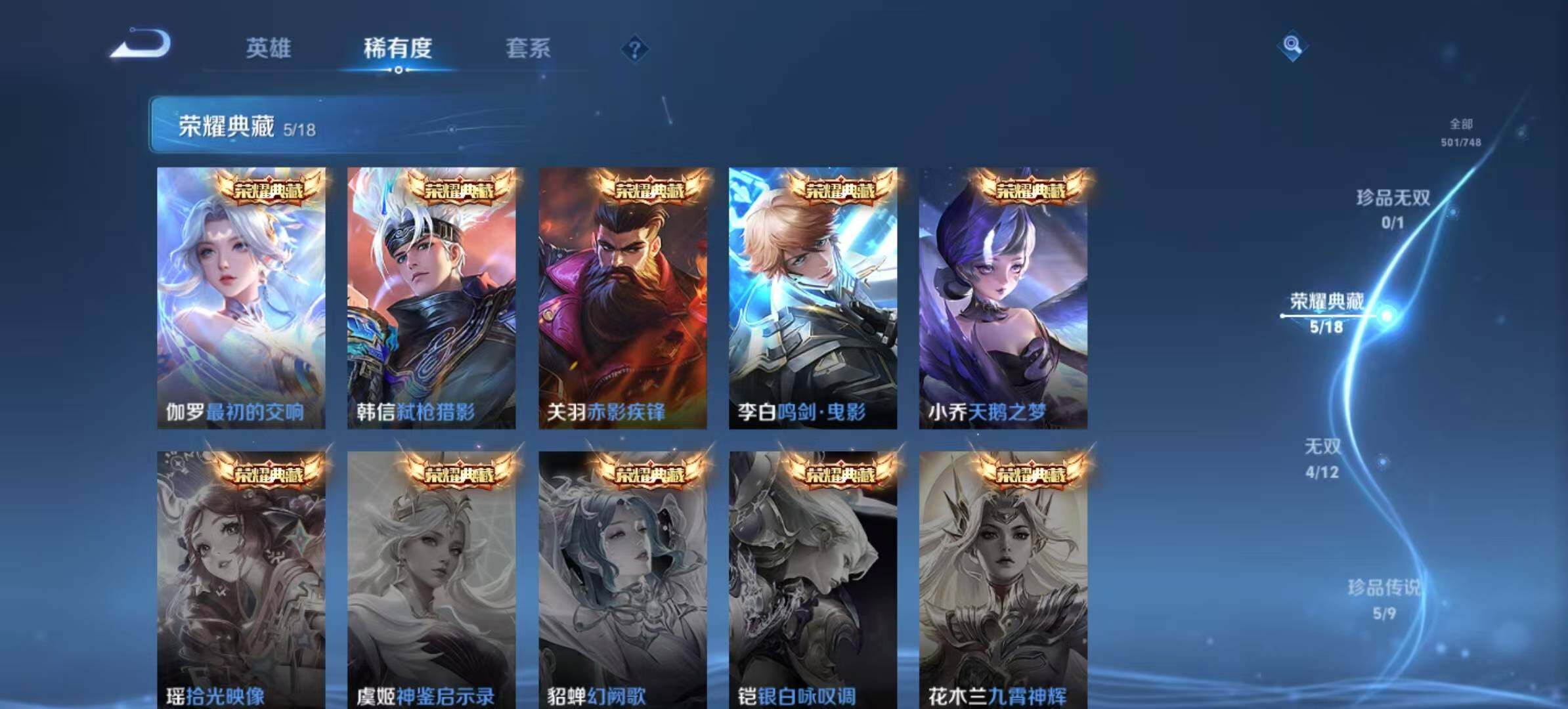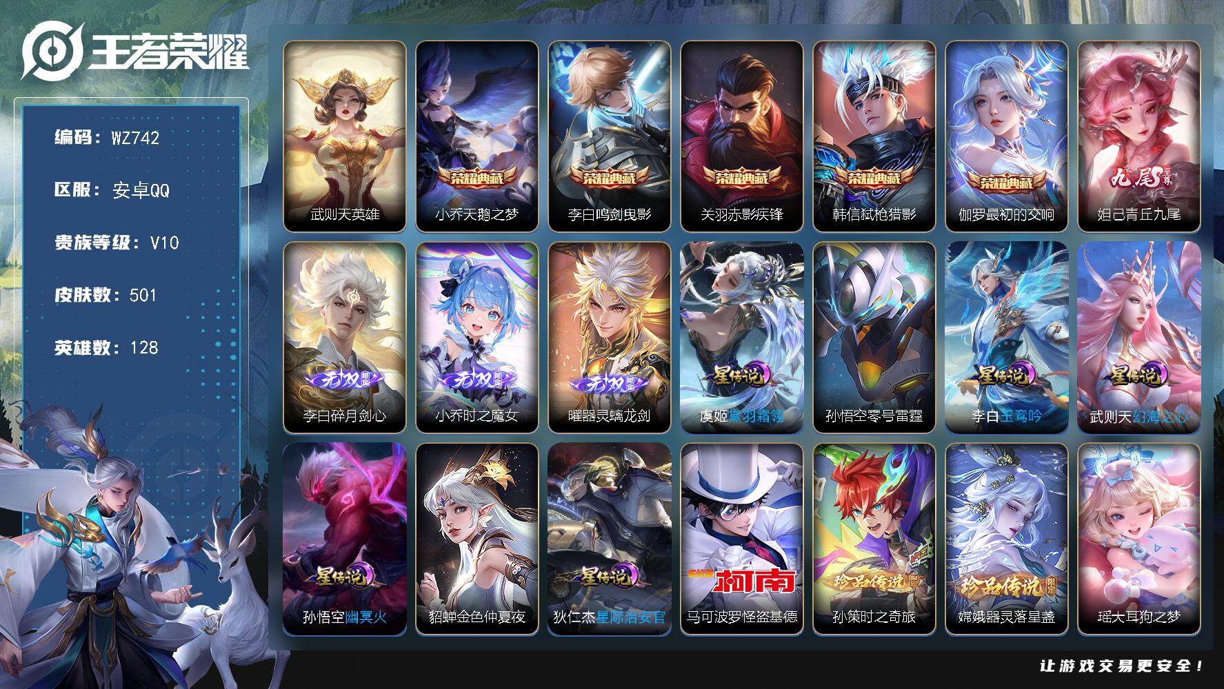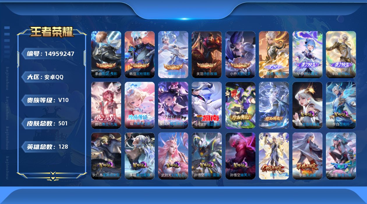 [14959247]安卓Q-V10501皮肤-5典藏皮肤-1典藏英雄-4无双-5珍品传说-62传说-155史诗