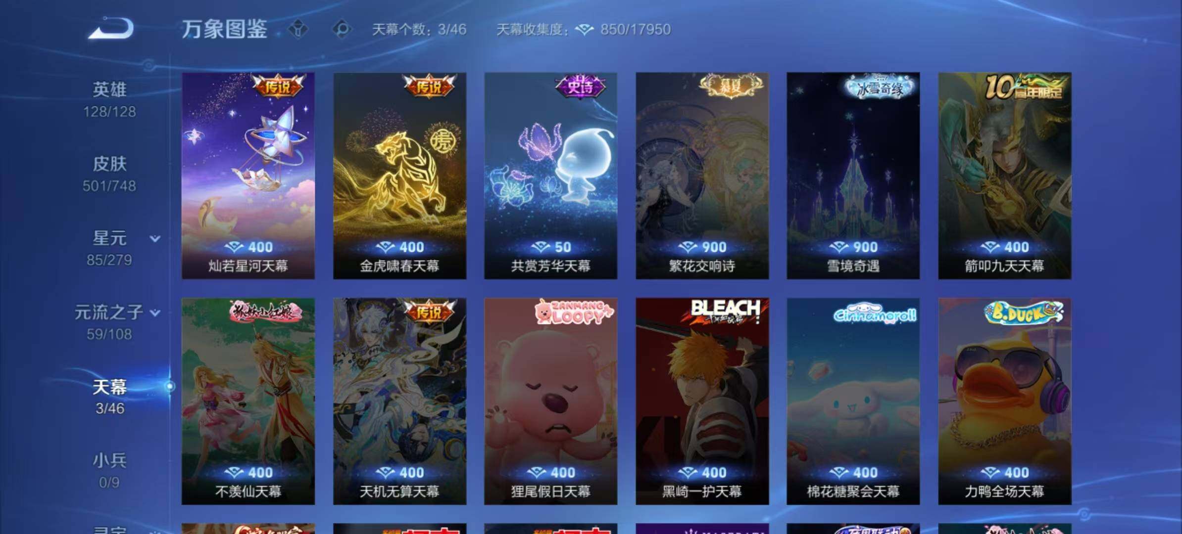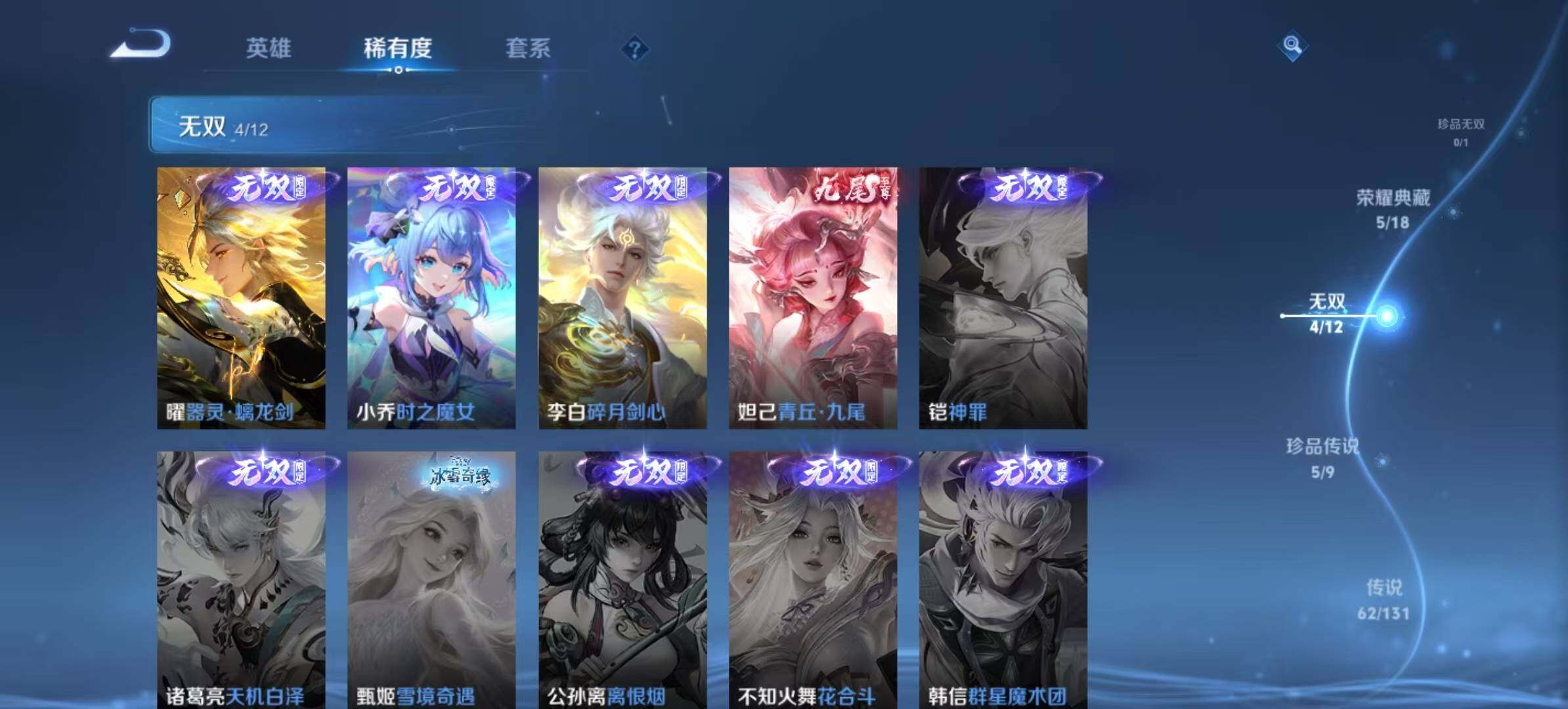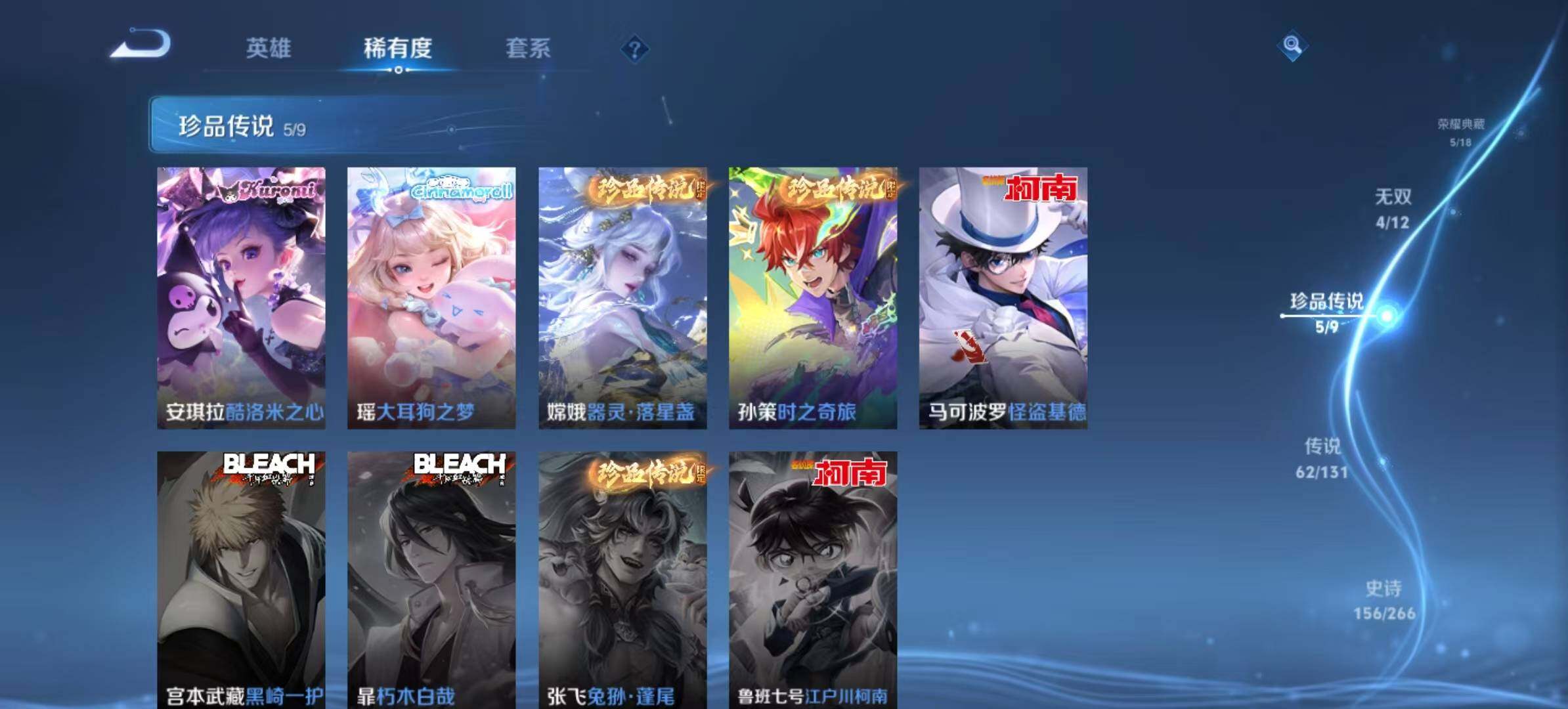 [14959247]安卓Q-V10501皮肤-5典藏皮肤-1典藏英雄-4无双-5珍品传说-62传说-155史诗