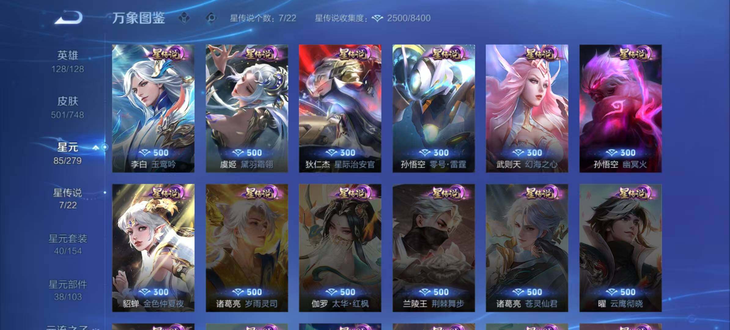 孙膑妖精王,扁鹊炼金王,虞姬凯尔特女王,白起狰,太乙真人饕餮,曹操烛龙,芈月重明,典韦穷奇,狂铁御狮,米莱狄御霄,牛魔御旌,盾山御銮,夏侯惇朔风刀,明世隐疑决卦,老夫子醍醐杖,鬼谷子原初探秘者,狄仁杰万华元夜,程咬金演武夺筹,钟馗驱傩正仪,苏烈千军破阵,吕布猎兽之王,嬴政白昼王子,女娲朔望之晖,典韦蓝屏警告,钟馗神迹守卫,鲁班七号狮舞东方,沈梦溪星空之诺,李元芳银河之约,马可波罗暗影游猎,蒙犽狂想玩偶喵,元歌云间偶戏,弈星混沌棋,达摩沙漠行僧,兰陵王金庭之子,沈梦溪大漠名商,李元芳云中旅人,桑启海盐诗旅,裴擒虎擒涛扼浪,鲁班大师探海日志,张良古海寻踪,项羽苍威无极,镜青焰无极