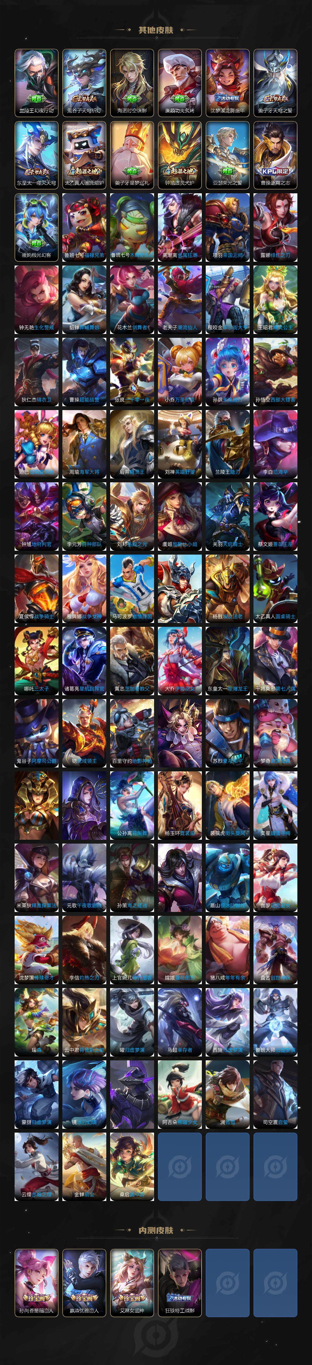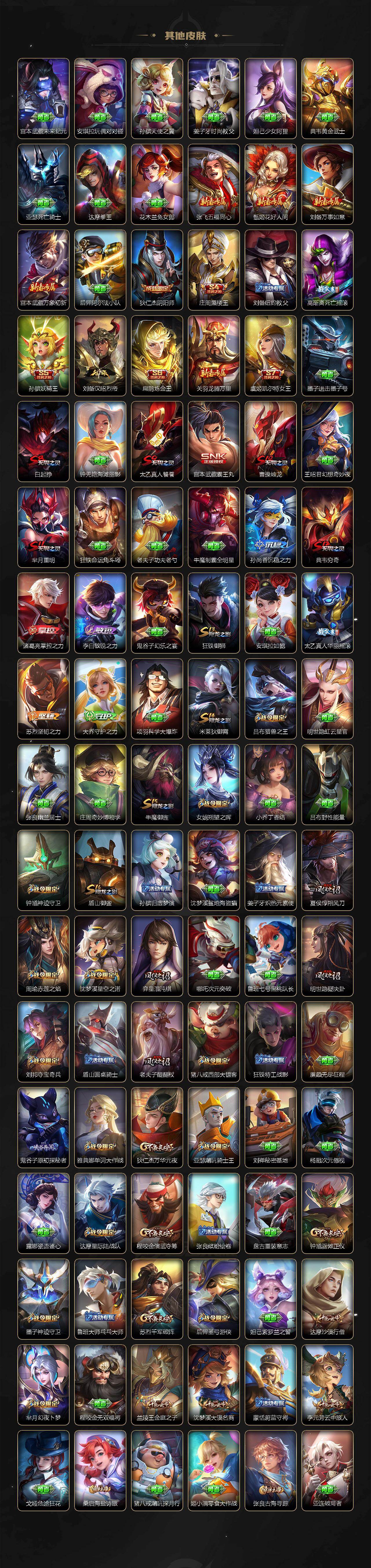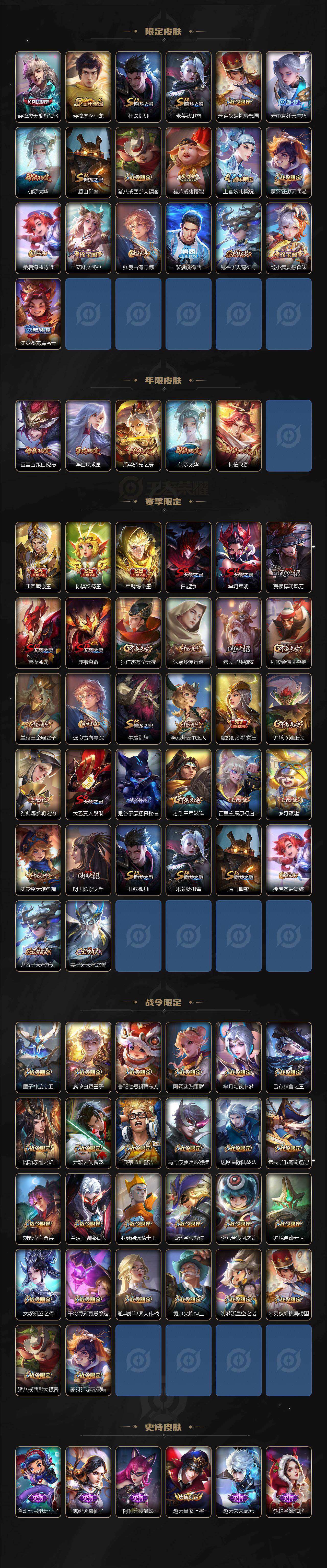 【限定皮肤】:白起狰,姜子牙天穹之誓,狄仁杰阴阳师,虞姬凯尔特女王,赵云皇家上将,墨子神迹守卫,妲己热情桑巴,嬴政优雅恋人,嬴政白昼王子,孙尚香蔷薇恋人,鲁班七号狮舞东方,庄周蜃楼王,高渐离死亡摇滚,阿轲迷踪丽影,孙膑妖精王,扁鹊炼金王,芈月重明,芈月幻夜卜梦,吕布天魔缭乱,吕布猎兽之王,周瑜赤莲之焰,元歌云间偶戏,元歌无心,夏侯惇朔风刀,甄姬游园惊梦,曹操烛龙,典韦穷奇,典韦蓝屏警告,马可波罗暗影游猎,狄仁杰魔术师,狄仁杰万华元夜,达摩星际陆战队,达摩沙漠行僧,项羽海滩派对,项羽霸王别姬,老夫子醍醐杖,老夫子航海奇遇记,程咬金演武夺筹,刘邦夺宝奇兵,韩信逐梦之影,韩信飞衡,兰陵王驯魔猎人,兰陵王金庭之子,花木兰青春决赛季,亚瑟潮玩骑士王,孙悟空至尊宝,孙悟空大圣娶亲,孙悟空零号赤焰,牛魔御旌,后羿辉光之辰,后羿如梦令,后羿圣弓游侠,李元芳银河之约,李元芳云中旅人,虞姬启明星使,钟馗神迹守卫,钟馗驱傩正仪,女娲朔望之晖,干将莫邪真爱魔法,雅典娜单词大作战,雅典娜黎明之约,蔡文姬繁星吟游,太乙真人饕餮,太乙真人华丽摇滚,东皇太一逐梦之光,鬼谷子原初探秘者,鬼谷子五谷丰年,诸葛亮武陵仙君,黄忠火炮绅士,苏烈千军破阵,百里玄策白虎志,百里玄策原初追逐者,弈星混沌棋,梦奇顽趣,公孙离蜜橘之夏,沈梦溪星空之诺,沈梦溪大漠名商,明世隐疑决卦,裴擒虎天狼狩猎者,裴擒虎李小龙,狂铁御狮,米莱狄御霄,米莱狄胡桃异想国,云中君纤云弄巧,伽罗太华,盾山御銮,猪八戒西部大镖客,猪八戒猪悟能,上官婉儿梁祝,蒙犽狂想玩偶喵,桑启海盐诗旅,艾琳女武神,张良古海寻踪,裴擒虎梅西,鬼谷子天穹祈灯,姬小满妄想食味,沈梦溪龙舞盛年