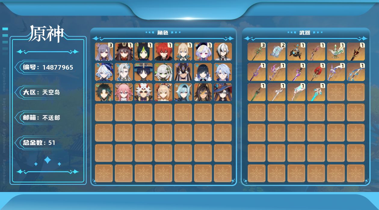 0命阿蕾奇诺,0命芙宁娜,0命那维莱特,0命迪希雅,0命流浪者,0命纳西妲,0命赛诺,1命提纳里,0命夜兰,0命神里绫人,0命八重神子,0命荒泷一斗,0命优菈,1命胡桃,0命魈,0命宵宫,3命刻晴,1命七七,1命琴,0命莫娜,1命迪卢克,0命丝柯克,精1金流监督,精1最初的大魔术,精1千夜浮梦,精1赤角石溃杵,精1终末嗟叹之诗,精1薙草之稻光,精1飞雷之弦振,精1雾切之回光,精1护摩之杖,精1磐岩结绿,精2四风原典,精3和璞鸢,精1天空之翼,精1阿莫斯之弓,精1天空之刃,精1风鹰剑