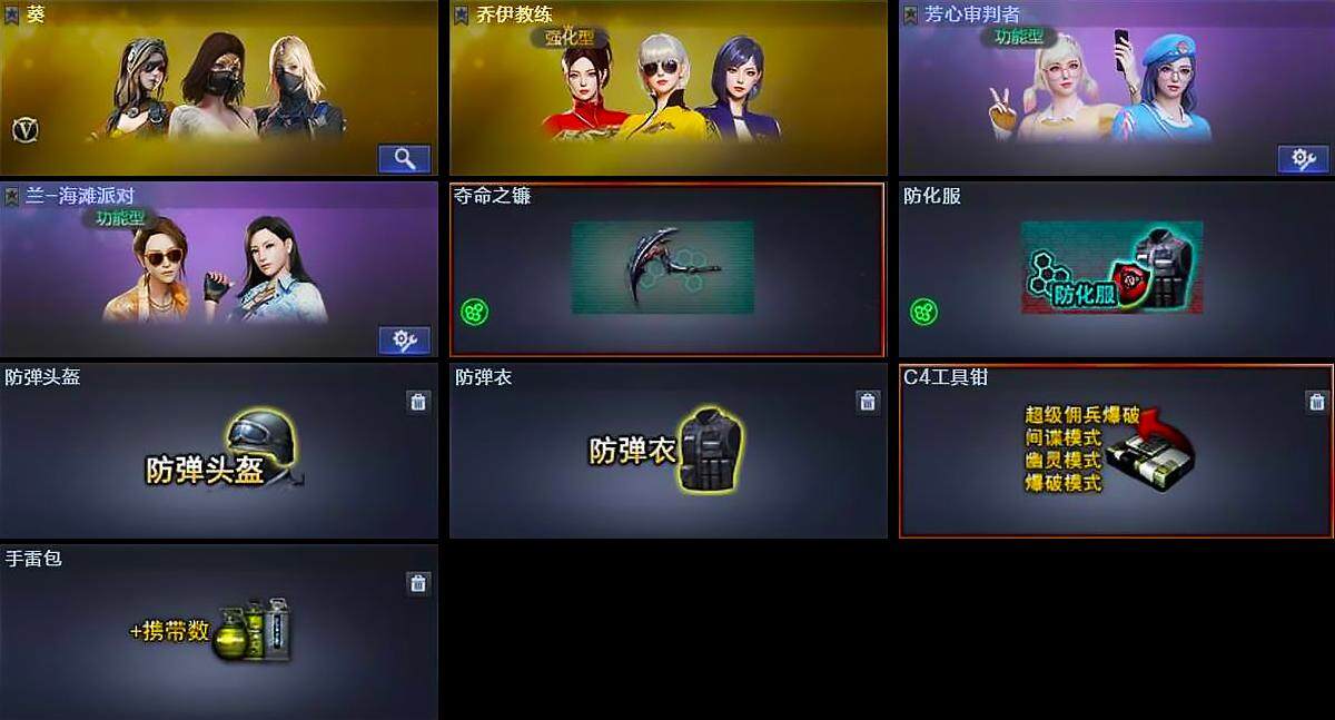 【道具】:夺命之镰,防化服,防弹头盔,防弹衣,C4工具钳,手雷包