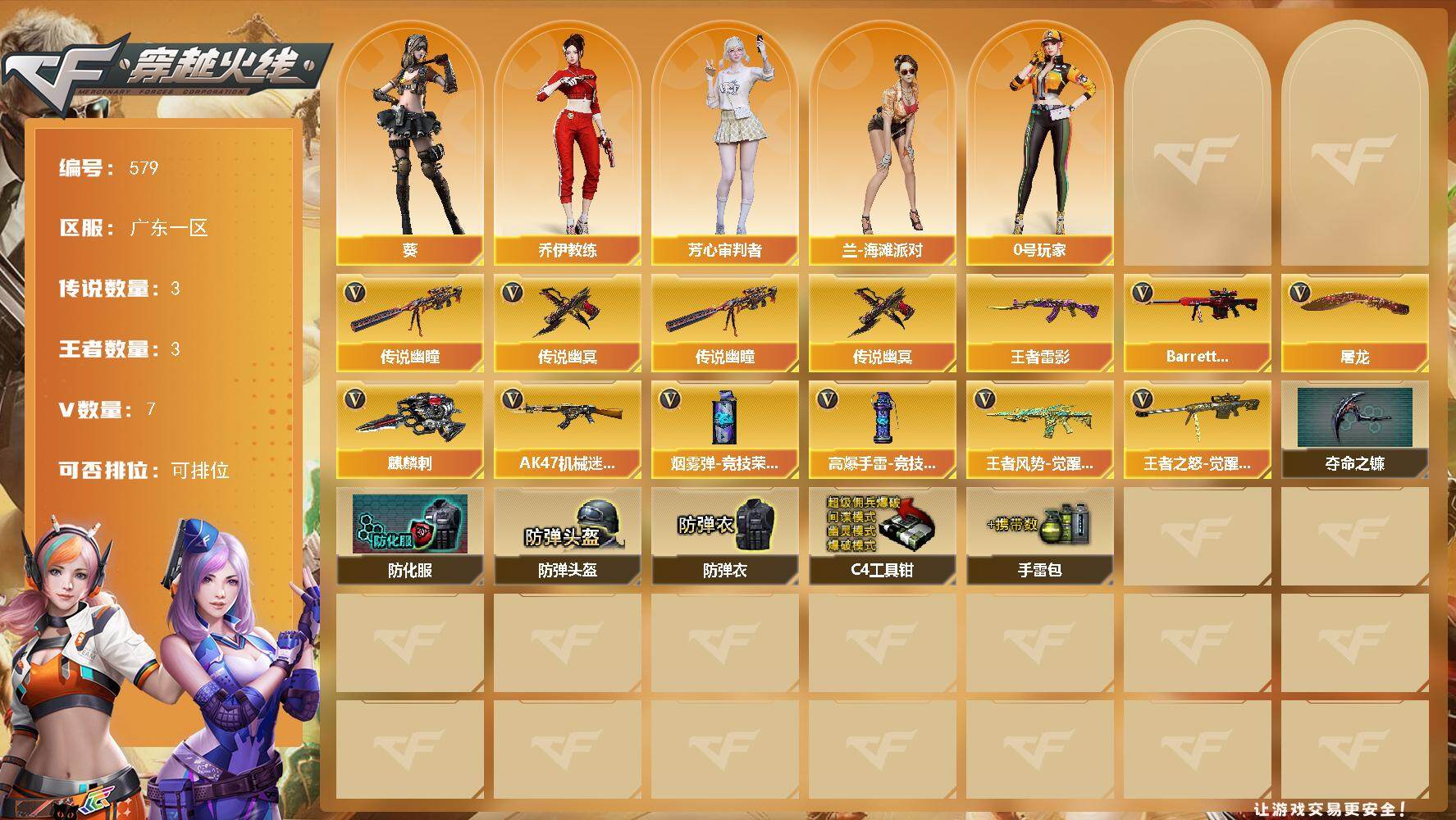 [14964740]广东一区-7V-3王者-0炫金 【传说武器】:传说幽瞳,传说幽冥*2 【热门武器】:传说幽瞳,传说幽冥*2 【王者炫金武器】:王者雷影 【角色】:葵,乔伊教练,芳心审判者,兰-海滩派对,0号玩家 【英雄级武器】:AK47-机械迷城,王者风势-觉醒版,Barrett-极光,王者之怒-觉醒版,屠龙,麒麟刺,高爆手雷-竞技荣光,烟雾弹-竞技荣光 【道具】:夺命之镰,防化服,防弹头盔,防弹衣,C4工具钳,手雷包 【特殊枪械】: