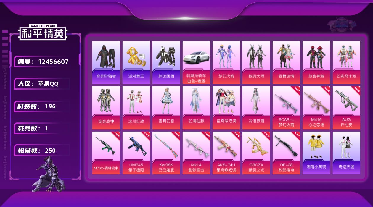 [12456607]苹果 手Q-11粉装-10特效枪-1载具-8粉色飞行器-85828热力值-11王牌印记-196套装-250枪皮 【热门品类】:粉装-梦幻火箭,套装-派对舞王,套装-奇异狩猎者,套装-胖达团团,套装-潮萌小黄鸭,角色-Mark.06 【粉色载具】:特斯拉Model 3(珍珠白) 【粉色套装】:粉装-数码大师,粉装-蝶舞迷情,粉装-梦幻火箭,粉装-放客神游,粉装-幻彩马卡龙,粉装-绚金战神,粉装-冰川红玫,粉装-雪月幻音,角色-幻海仙踪,粉装-星穹咏叹调,角色-冷漠罗丽 【粉色枪皮等级】:SCAR-L-梦幻火箭(七级),M416-心之恋语(六级),GROZA-精灵之光(三级),AUG-许七安(六级),M762-青锋波束(五级),UMP45-量子极限(五级),AKS-74U-星穹咏叹调(四级),Kar98K-巳巳如意(五级),Mk14-甜梦熊击(五级),DP-28-豹影疾电(一级) 【粉色枪皮】:SCAR-L-梦幻火箭,M416-心之恋语,GROZA-精灵之光,AUG-许七安,M762-青锋波束,UMP45-量子极限,AKS-74U-星穹咏叹调,Kar98K-巳巳如意,Mk14-甜梦熊击,DP-28-豹影疾电 【粉色飞行器】:春暖花开飞行器,梦幻火箭飞行器,镜光幻境飞行翼,繁龙极客飞行器,龙翔九天飞行器,幽焰列车飞行器,终晖之翼飞行器 【粉色降落伞】:春暖花开降落伞,梦幻火箭降落伞,星之信仰降落伞,繁花小夜曲降落伞,四圣焕新降落伞,潮汐统领降落伞,环太平洋降落伞,彩虹甜喵降落伞,萌物绒绒降落伞,霓虹漫游降落伞,精灵梦叶罗丽降落伞,星梦奇缘降落伞,临安公主降落伞,月影灵韵降落伞,赛博古神降落伞,晶梦幻蝶降落伞,智耀战神降落伞,星穹咏叹调降落伞,双重狂想降落伞 【稀有套装】:套装-熊抱抱,套装-巳巳如意,套装-雏菊兔兔,套装-萝兰蝴蝶,套装-小熊娃娃,套装-糖糖葫芦,套装-青团波波,套装-棉花软糖,角色-都市丽猫,套装-净心行者,套装-燕燕于飞,套装-鱼渊荷华,套装-晶辉守护,角色-糖霜甜心,套装-粉恋花,套装-紫幽梦,套装-蓝冰羽,套装-星影赞美诗,套装-星渊小夜曲,套装-霓虹热舞,套装-彩虹兔,套装-云朵鹅,套装-雪绒豹,套装-蓝海鲸歌 【稀有枪皮】:AKM-天启纪元,AKM-春暖花开,AKM-破晓战魂,AKM-萌趣颜团子,AKM-霓虹街区,AKM-龙的传人,M16A4