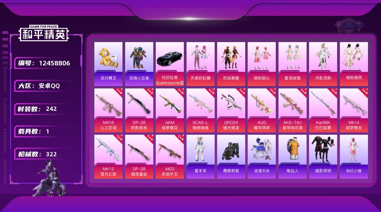 [12458806]安卓 手Q-6粉装-12特效枪-1载具-2粉色飞行器-107661热力值-17王牌印记-242套装-322枪皮 【热门品类】:套装-浪漫天命,套装-派对舞王,套装-深海小丑鱼,套装-龟仙人,套装-暗影哥特,套装-粉红小猪,角色-Mark.06 【粉色载具】:玛莎拉蒂Quattroporte(夜幕蓝) 【粉色套装】:粉装-天使彩虹糖,粉装-烈焰拳霸,粉装-飒粉甜心,粉装-蜜语绒猫,角色-月影灵韵,粉装-桃粉嫣然 【粉色枪皮等级】:AKM-绿萝繁花(五级),SCAR-L-锦绣绵绵(五级),M416-心之恋语(六级),GROZA-镜光银凌(五级),AUG-暖羊咩咩(五级),AKS-74U-星穹咏叹调(五级),Kar98K-巳巳如意(五级),Mk14-甜梦熊击(五级),MK12-雪月幻音(四级),DP-28-暗夜鎏金(四级),DP-28-豹影疾电(五级),MG3-炙焰牛王(四级) 【粉色枪皮】:AKM-绿萝繁花,SCAR-L-锦绣绵绵,M416-心之恋语,GROZA-镜光银凌,AUG-暖羊咩咩,AKS-74U-星穹咏叹调,Kar98K-巳巳如意,Mk14-甜梦熊击,MK12-雪月幻音,DP-28-暗夜鎏金,DP-28-豹影疾电,MG3-炙焰牛王 【粉色飞行器】:太空嘟嘟飞行器,雀灵庇佑飞行器 【粉色降落伞】:神秘黑猫降落伞,阿狸红降落伞,暗夜玫瑰降落伞,齐天大圣降落伞,蓝莓炮弹降落伞,环太平洋降落伞,垂柳戏鸭降落伞,旋转彩虹降落伞,第五大道降落伞,闲梦青缨降落伞,猪猪侠降落伞,蜜语绒猫降落伞,临安公主降落伞,脆鲨七海降落伞,金蛇镇世降落伞,墨金战记降落伞,幻彩电音降落伞 【稀有套装】:套装-龟仙人,套装-巳巳如意,角色-米开朗基罗,套装-糖糖葫芦,套装-青团波波,套装-棉花软糖,角色-都市丽猫,套装-燕燕于飞,套装-鱼渊荷华,角色-风玲,套装-晶辉守护,套装-粉恋花,套装-紫幽梦,套装-蓝冰羽,套装-霓虹热舞,套装-彩虹兔,套装-云朵鹅,套装-雪绒豹,玩偶服-喜羊羊 【稀有枪皮】:AKM-墨染幽兰,AKM-夜灯,AKM-彩虹符号,AKM-影袭,AKM-灼热熔岩,AKM-环太平洋,AKM-生命誓言,AKM-破晓战魂,AKM-缤纷海域,AKM-萌趣颜团子,AKM-虎虎生威,AKM-霓虹街区,AKM-龙的传人,M16A4-凝视深渊,M16A4-幻世战舞者,M16A4-甜心亚梦,