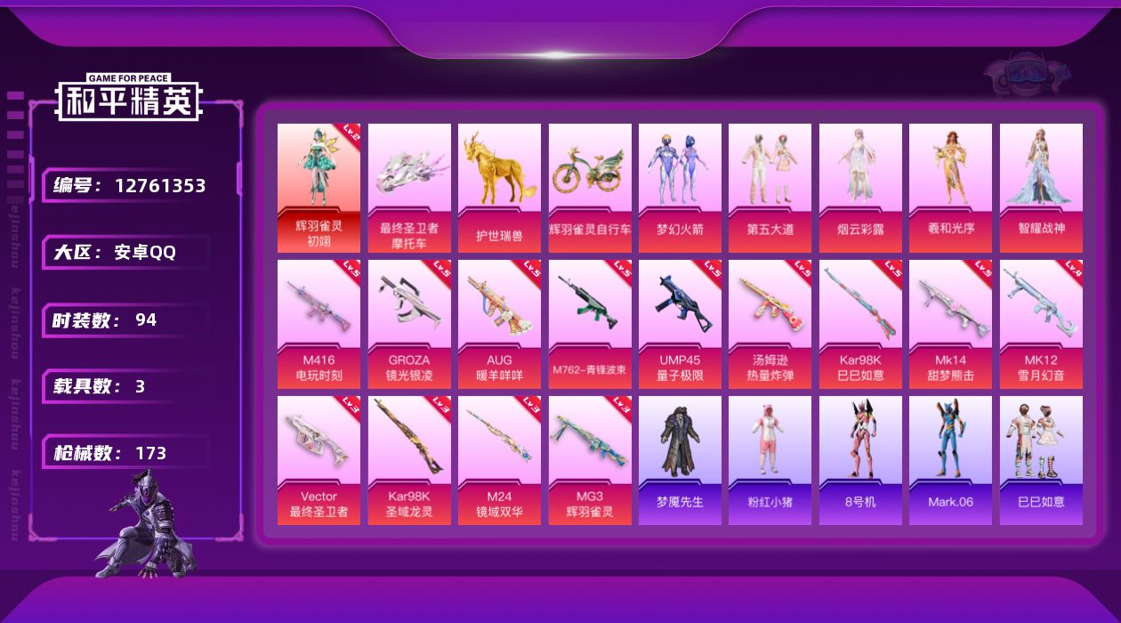 [12761353]安卓 手Q-1神装-5粉装-13特效枪-3载具-9粉色飞行器-61965热力值-8王牌印记-94套装-173枪皮
