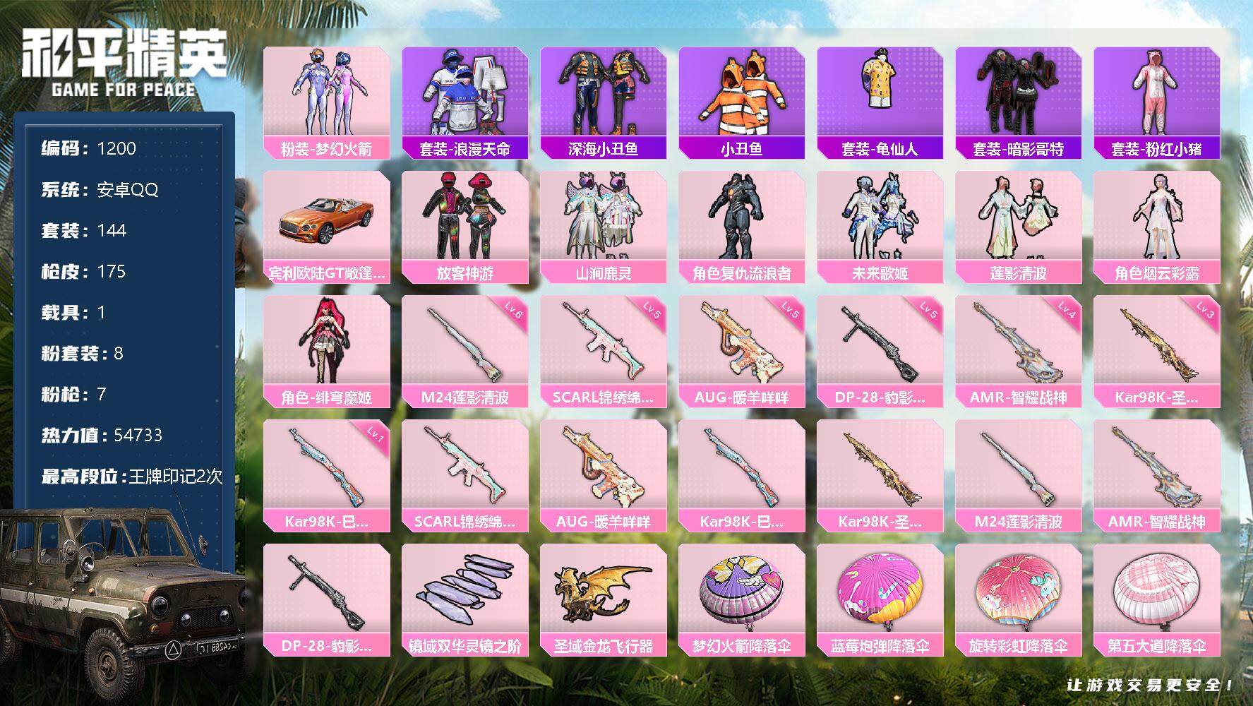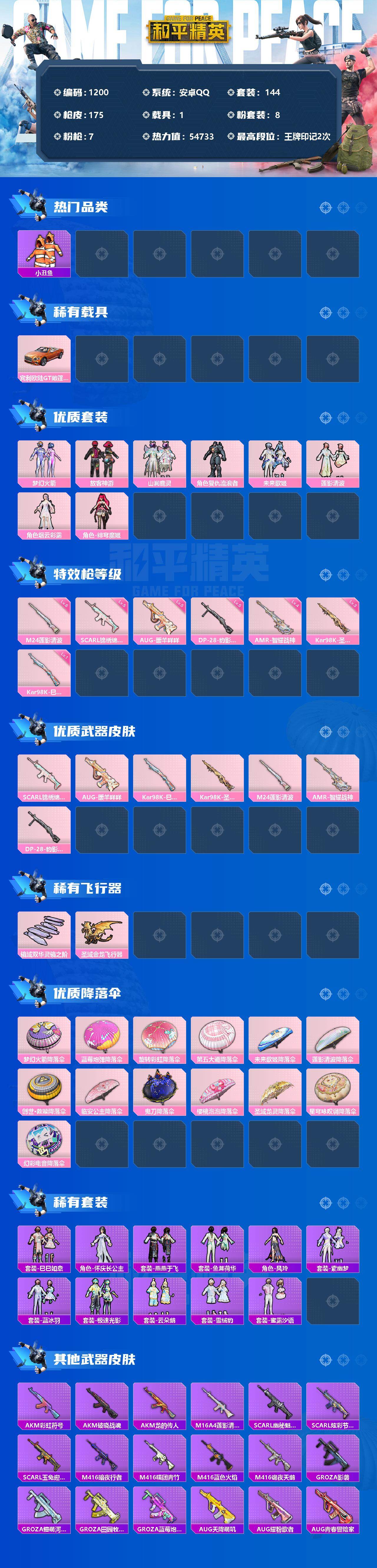 [12809670]安卓 手Q-8粉装-7特效枪-1载具-2粉色飞行器-54733热力值-2王牌印记-144套装-175枪皮 【热门品类】:粉装-梦幻火箭,套装-浪漫天命,套装-深海小丑鱼,套装-小丑鱼,套装-龟仙人,套装-暗影哥特,套装-粉红小猪 【粉色载具】:宾利欧陆GT敞篷(火焰橘) 【粉色套装】:粉装-梦幻火箭,粉装-放客神游,粉装-山涧鹿灵,角色-复仇流浪者,粉装-未来歌姬,粉装-莲影清波,角色-烟云彩露,角色-绯穹魔姬 【粉色枪皮等级】:SCAR-L-锦绣绵绵(五级),AUG-暖羊咩咩(五级),Kar98K-巳巳如意(一级),Kar98K-圣域龙灵(三级),M24-莲影清波(六级),AMR-智耀战神(四级),DP-28-豹影疾电(五级) 【粉色枪皮】:SCAR-L-锦绣绵绵,AUG-暖羊咩咩,Kar98K-巳巳如意,Kar98K-圣域龙灵,M24-莲影清波,AMR-智耀战神,DP-28-豹影疾电 【粉色飞行器】:镜域双华-灵镜之阶,圣域金龙飞行器 【粉色降落伞】:梦幻火箭降落伞,蓝莓炮弹降落伞,旋转彩虹降落伞,第五大道降落伞,未来歌姬降落伞,莲影清波降落伞,创世·救赎降落伞,临安公主降落伞,鬼刀降落伞,樱桃泡泡降落伞,圣域龙灵降落伞,星穹咏叹调降落伞,幻彩电音降落伞 【稀有套装】:套装-龟仙人,套装-巳巳如意,角色-怀庆长公主,套装-燕燕于飞,套装-鱼渊荷华,角色-风玲,套装-紫幽梦,套装-蓝冰羽,套装-极速光影,套装-云朵鹅,套装-雪绒豹,套装-蜜露汐语 【稀有枪皮】:AKM-彩虹符号,AKM-破晓战魂,AKM-龙的传人,M16A4-莲影清波,SCAR-L-幽秘魅影,SCAR-L-炫彩节奏,SCAR-L-玉兔迎春,M416-暗夜行者,M416-糯团青竹,M416-蓝色火焰,M416-诡夜天鹅,GROZA-影袭,GROZA-懵萌河马,GROZA-田园牧歌,GROZA-蓝莓炮弹,AUG-天降萌叽,AUG-耀粉歌者,AUG-青春冒险家,M762-天降萌叽,M762-第五大道,M762-云朵鹅,Mk47-妙红点点,Mk47-洛神天依,Mk47-炫光之旅,G36C-镜域双华,G36C-懵萌河马,AC-VAL-天降萌叽,AC-VAL-快闪甜心,蜜獾-垂柳戏鸭,蜜獾-天降萌叽,蜜獾-娇憨猪猪,蜜獾-绯穹魔姬,UZI-啾咪啾咪,UZI-娇憨猪猪,UZI-影袭,UZI-红色方程式,UZI