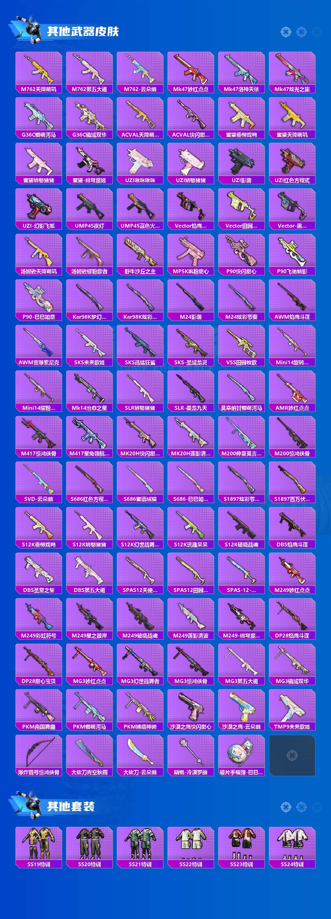 【稀有枪皮】:AKM-彩虹符号,AKM-破晓战魂,AKM-龙的传人,M16A4-莲影清波,SCAR-L-幽秘魅影,SCAR-L-炫彩节奏,SCAR-L-玉兔迎春,M416-暗夜行者,M416-糯团青竹,M416-蓝色火焰,M416-诡夜天鹅,GROZA-影袭,GROZA-懵萌河马,GROZA-田园牧歌,GROZA-蓝莓炮弹,AUG-天降萌叽,AUG-耀粉歌者,AUG-青春冒险家,M762-天降萌叽,M762-第五大道,M762-云朵鹅,Mk47-妙红点点,Mk47-洛神天依,Mk47-炫光之旅,G36C-镜域双华,G36C-懵萌河马,AC-VAL-天降萌叽,AC-VAL-快闪甜心,蜜獾-垂柳戏鸭,蜜獾-天降萌叽,蜜獾-娇憨猪猪,蜜獾-绯穹魔姬,UZI-啾咪啾咪,UZI-娇憨猪猪,UZI-影袭,UZI-红色方程式,UZI