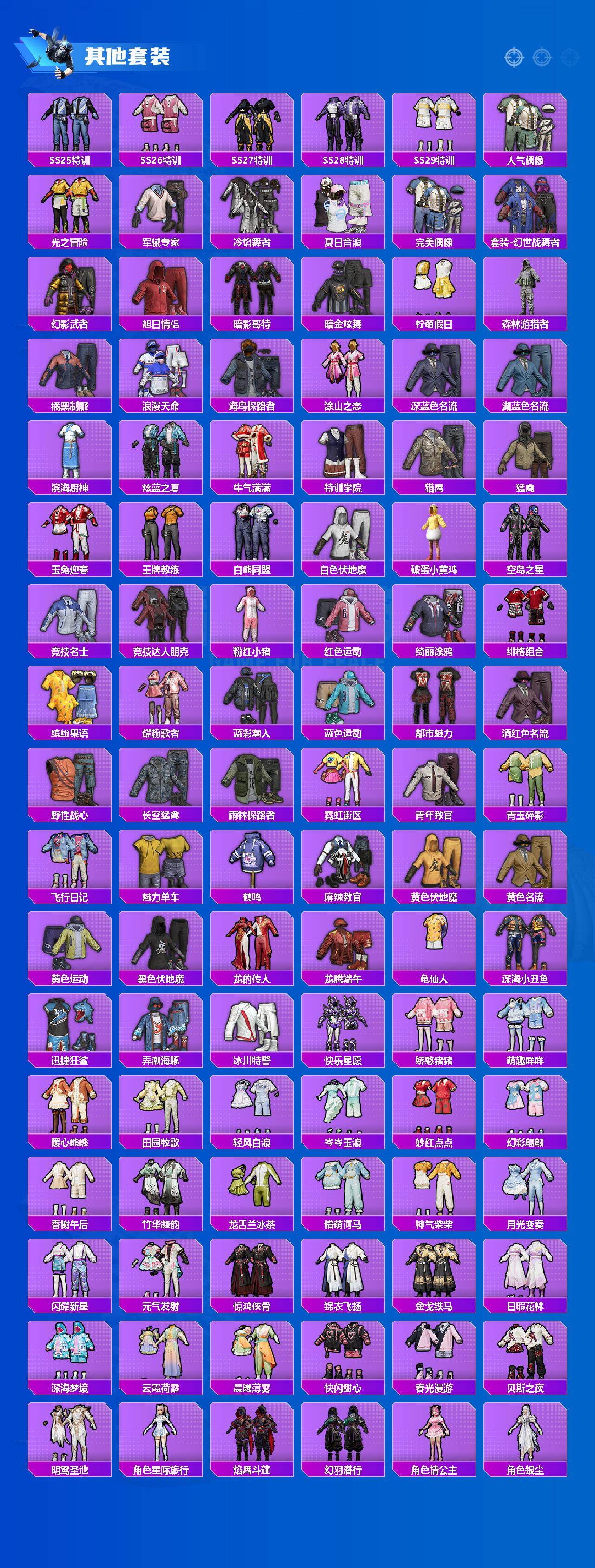 套装-梦幻火箭,套装-深海小丑鱼,套装-放客神游,套装-山涧鹿灵,角色-复仇流浪者,套装-未来歌姬,套装-莲影清波,角色-烟云彩露,套装-迅捷狂鲨