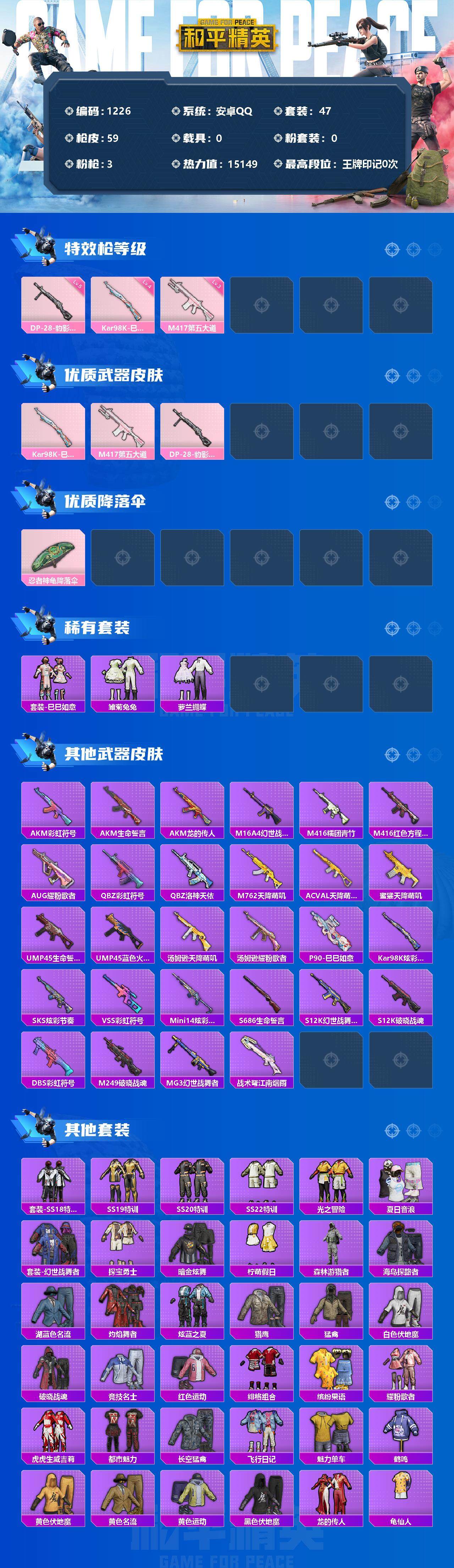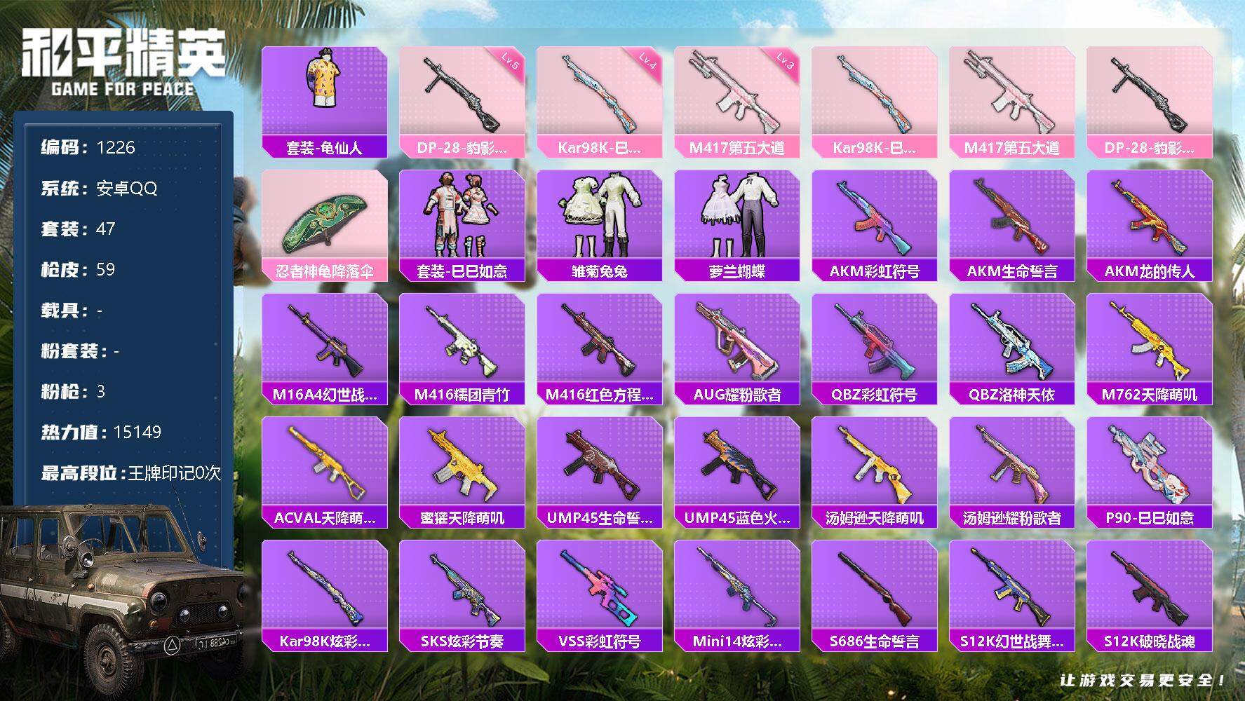 [12843431]安卓 手Q-0粉装-3特效枪-0载具-0粉色飞行器-15149热力值-1王牌印记-47套装-59枪皮 【热门品类】:套装-龟仙人 【粉色枪皮等级】:Kar98K-巳巳如意(四级),M417-第五大道(三级),DP-28-豹影疾电(五级) 【粉色枪皮】:Kar98K-巳巳如意,M417-第五大道,DP-28-豹影疾电 【粉色降落伞】:忍者神龟降落伞 【稀有套装】:套装-龟仙人,套装-巳巳如意,套装-雏菊兔兔,套装-萝兰蝴蝶 【稀有枪皮】:AKM-彩虹符号,AKM-生命誓言,AKM-龙的传人,M16A4-幻世战舞者,M416-糯团青竹,M416-红色方程式,AUG-耀粉歌者,QBZ-彩虹符号,QBZ-洛神天依,M762-天降萌叽,AC-VAL-天降萌叽,蜜獾-天降萌叽,UMP45-生命誓言,UMP45-蓝色火焰,汤姆逊-天降萌叽,汤姆逊-耀粉歌者,P90-巳巳如意,Kar98K-炫彩节奏,SKS-炫彩节奏,VSS-彩虹符号,Mini14-炫彩节奏,S686-生命誓言,S12K-破晓战魂,S12K-幻世战舞者,DBS-彩虹符号,M249-破晓战魂,MG3-幻世战舞者,战术弩-江南烟雨 【其他套装】:套装-SS18特训,套装-SS19特训,套装-SS20特训,套装-SS22特训,套装-光之冒险,套装-夏日音浪,套装-幻世战舞者,套装-探宝勇士,套装-暗金炫舞,套装-柠萌假日,套装-森林游猎者,套装-海岛探路者,套装-湖蓝色名流,套装-灼焰舞者,套装-炫蓝之夏,套装-猎鹰,套装-猛禽,套装-白色伏地魔,套装-破晓战魂,套装-竞技名士,套装-红色运动,套装-绯格组合,套装-缤纷果语,套装-耀粉歌者,套装-虎虎生威吉莉,套装-都市魅力,套装-长空猛禽,套装-飞行日记,套装-魅力单车,套装-鹤鸣,套装-黄色伏地魔,套装-黄色名流,套装-黄色运动,套装-黑色伏地魔,套装-龙的传人,套装-龟仙人 【营地ID】:751459162