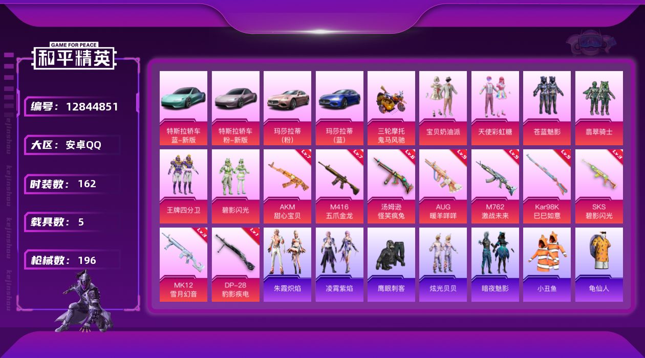 [12844851]安卓 手Q-6粉装-9特效枪-5载具-1粉色飞行器-76146热力值-15王牌印记-162套装-196枪皮 【热门品类】:套装-小丑鱼,套装-龟仙人 【粉色载具】:特斯拉Roadster(水滴蓝),特斯拉Roadster(沁心粉),玛莎拉蒂Ghibli(粉),玛莎拉蒂Ghibli(蓝),鬼马风驰 【粉色套装】:粉装-宝贝奶油派,粉装-天使彩虹糖,粉装-苍蓝魅影,粉装-翡翠骑士,粉装-王牌四分卫,粉装-碧影闪光 【粉色枪皮等级】:AKM-甜心宝贝(七级),M416-五爪金龙(七级),AUG-暖羊咩咩(五级),M762-激战未来(五级),汤姆逊-怪笑疯兔(六级),Kar98K-巳巳如意(五级),SKS-碧影闪光(三级),MK12-雪月幻音(三级),DP-28-豹影疾电(一级) 【粉色枪皮】:AKM-甜心宝贝,M416-五爪金龙,AUG-暖羊咩咩,M762-激战未来,汤姆逊-怪笑疯兔,Kar98K-巳巳如意,SKS-碧影闪光,MK12-雪月幻音,DP-28-豹影疾电 【粉色飞行器】:王牌四分卫飞行器 【粉色降落伞】:深海曼妙降落伞,粉色回忆降落伞,甜心宝贝降落伞,至尊龙雀降落伞,夏日绵绵冰降落伞,激战未来降落伞,银刃赛罗降落伞,暗翼战神降落伞,王牌四分卫降落伞,星之彼岸降落伞,怪笑疯兔降落伞,烈焰拳霸降落伞,暗夜玫瑰降落伞,碧影闪光降落伞,恐龙拽拽降落伞,闲梦青缨降落伞 【稀有套装】:套装-龟仙人,角色-都市丽猫,套装-朱霞炽焰,套装-凌霄紫焰 【稀有枪皮】:AKM-冰凉西瓜,AKM-夜灯,AKM-恐龙拽拽,AKM-星之彼岸,AKM-灼热熔岩,AKM-生命誓言,AKM-破晓战魂,AKM-缤纷海域,AKM-萌趣颜团子,AKM-虎虎生威,AKM-霓虹街区,AKM-龙的传人,M16A4-夜灯,M16A4-幻世战舞者,SCAR-L-玉兔迎春,SCAR-L-王牌四分卫,SCAR-L-碧影闪光,SCAR-L-黄金龙骨,M416-圣诞惊喜,M416-滑板小狐,M416-糯团青竹,GROZA-异彩先驱,GROZA-彩虹符号,GROZA-恐龙拽拽,GROZA-治愈之星,AUG-天降萌叽,AUG-幻影战神,AUG-怪笑疯兔,AUG-炫光贝贝,AUG-耀粉歌者,AUG-青春冒险家,QBZ-彩虹符号,QBZ-暗翼战神,QBZ-赛罗,QBZ-飞驰魅影,M762-天降萌叽,M762-瑞龙福将,M7