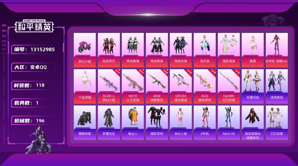 [13152985]安卓 手Q-9粉装-6特效枪-1载具-2粉色飞行器-58323热力值-12王牌印记-118套装-196枪皮