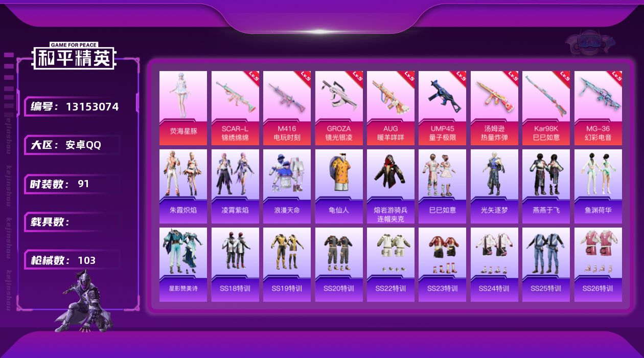 [13153074]安卓 手Q-1粉装-8特效枪-0载具-0粉色飞行器-30091热力值-4王牌印记-91套装-103枪皮