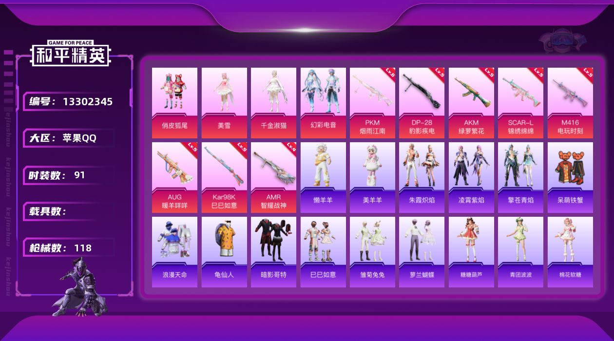[13302345]苹果 手Q-4粉装-8特效枪-0载具-3粉色飞行器-46079热力值-8王牌印记-91套装-118枪皮 【热门品类】:套装-浪漫天命,套装-龟仙人,套装-暗影哥特 【粉色套装】:粉装-俏皮狐尾,角色-美雪,角色-千金淑猫,粉装-幻彩电音 【粉色枪皮等级】:AKM-绿萝繁花(五级),SCAR-L-锦绣绵绵(五级),M416-电玩时刻(五级),AUG-暖羊咩咩(五级),Kar98K-巳巳如意(五级),AMR-智耀战神(四级),DP-28-豹影疾电(五级),PKM-江南烟雨(六级) 【粉色枪皮】:AKM-绿萝繁花,SCAR-L-锦绣绵绵,M416-电玩时刻,AUG-暖羊咩咩,Kar98K-巳巳如意,AMR-智耀战神,DP-28-豹影疾电,PKM-江南烟雨 【粉色飞行器】:天之羽翼飞行器,晶梦幻蝶飞行器 【粉色降落伞】:快乐主宰降落伞,洛神天依降落伞,圣堂之誓降落伞,江南烟雨降落伞,忍者神龟降落伞,临安公主降落伞,智耀战神降落伞,星穹咏叹调降落伞,幻彩电音降落伞 【稀有套装】:套装-龟仙人,套装-巳巳如意,套装-雏菊兔兔,套装-萝兰蝴蝶,套装-糖糖葫芦,套装-青团波波,套装-棉花软糖,角色-许七安,角色-怀庆长公主,套装-燕燕于飞,套装-鱼渊荷华,玩偶服-小狗蛇点点,套装-晶灵使者,套装-晶辉守护,套装-粉恋花,套装-紫幽梦,套装-蓝冰羽,角色-瑰梦爱神,套装-星渊小夜曲,套装-极速光影,套装-彩虹兔,套装-云朵鹅,套装-雪绒豹,角色-绛羽幽主,套装-朱霞炽焰,套装-凌霄紫焰,套装-擎苍青焰,玩偶服-懒羊羊,玩偶服-美羊羊 【稀有枪皮】:AKM-恐龙拽拽,AKM-霓虹街区,SCAR-L-小狗蛇点点,M762-云朵鹅,AC-VAL-快闪甜心,蜜獾-天降萌叽,ARX-凌霄紫焰,UZI-啾咪啾咪,UZI-天降萌叽,UMP45-绒宝小鹅,Vector-焰鹰斗篷,JS9-凌霄紫焰,P90-快闪甜心,P90-巳巳如意,Kar98K-彩虹符号,Kar98K-洛神天依,Kar98K-红色方程式,M24-幻彩电音,M24-时光之吻,AWM-焰鹰斗篷,AWM-圣堂之誓,Mini14-绯穹魔姬,Win94-晶梦幻蝶,莫辛纳甘-蜜语绒猫,AMR-喜羊羊与灰太狼,MK20-H-快闪甜心,SVD-云朵鹅,S686-巳巳如意,DBS-焰鹰斗篷,DBS-圣堂之誓,DBS-幻彩电音,SPAS-12-云朵鹅
