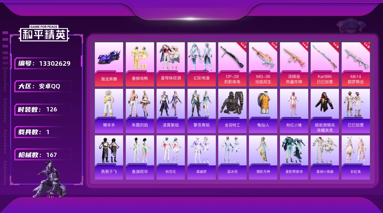 [13302629]安卓 手Q-3粉装-5特效枪-1载具-2粉色飞行器-48470热力值-7王牌印记-126套装-167枪皮