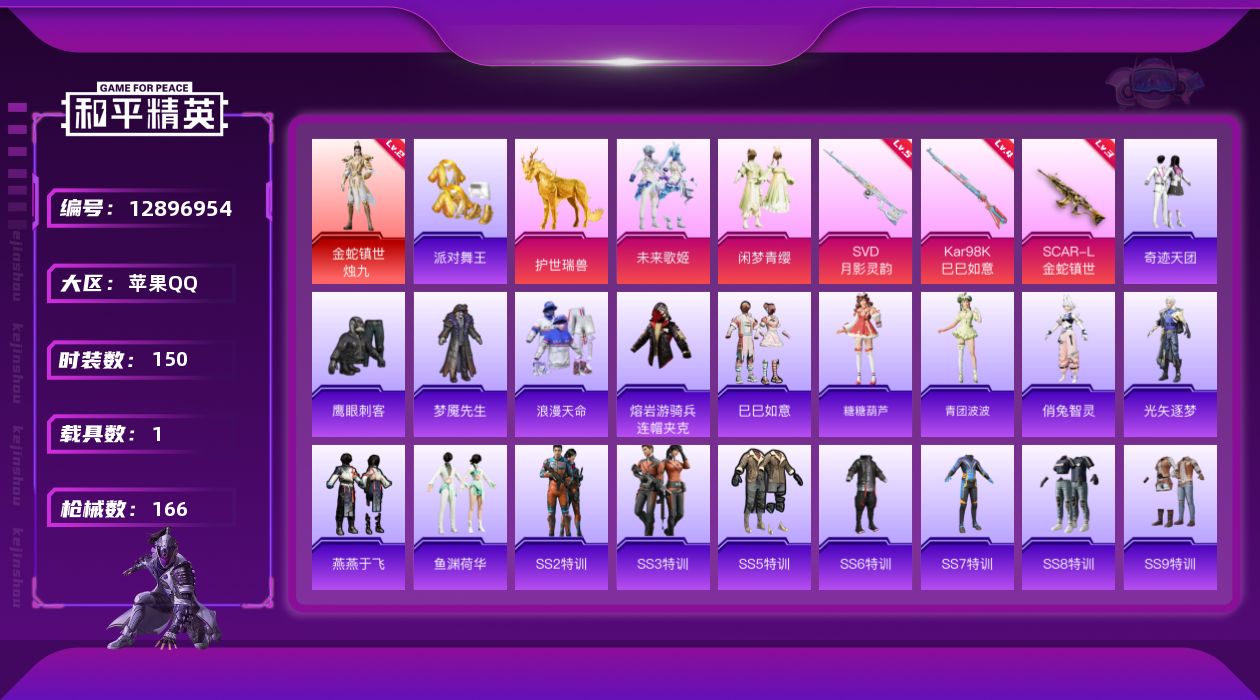 [12896954]苹果 手Q-1神装-2粉装-3特效枪-1载具-3粉色飞行器-50055热力值-7王牌印记-150套装-166枪皮 【红色神装等级】:金蛇镇世-烛九(二级) 【红色角色神装】:金蛇镇世-烛九 【热门品类】:套装-浪漫天命,套装-派对舞王,套装-SS1特训,小恶魔头饰,熔岩游骑兵面罩,熔岩游骑兵连帽夹克 【粉色载具】:护世瑞兽 【粉色套装】:粉装-未来歌姬,粉装-闲梦青缨 【粉色枪皮等级】:SCAR-L-金蛇镇世(三级),Kar98K-巳巳如意(四级),SVD-月影灵韵(五级) 【粉色枪皮】:SCAR-L-金蛇镇世,Kar98K-巳巳如意,SVD-月影灵韵 【粉色飞行器】:龙翔九天飞行器,凤舞九天飞行器 【粉色降落伞】:凝视深渊降落伞,环太平洋降落伞,海螺星光降落伞,炫光之旅降落伞,临安公主降落伞,月影灵韵降落伞,盛世惊鸿降落伞 【稀有套装】:套装-巳巳如意,套装-糖糖葫芦,套装-青团波波,角色-俏兔智灵,角色-光矢逐梦,套装-燕燕于飞,套装-鱼渊荷华 【稀有枪皮】:AKM-冰凉西瓜,AKM-夜灯,AKM-彩虹符号,AKM-春暖花开,AKM-生命誓言,AKM-破晓战魂,AKM-龙的传人,M16A4-幻世战舞者,M16A4-生命誓言,SCAR-L-暗夜玫瑰,SCAR-L-玉兔迎春,SCAR-L-红色方程式,SCAR-L-净心行者,M416-红色方程式,M416-蓝色火焰,M416-黄金狮王,GROZA-2B战斗服款,GROZA-懵萌河马,GROZA-春暖花开,AUG-天降萌叽,AUG-甜蜜菠萝,AUG-耀粉歌者,QBZ-彩虹符号,QBZ-诡娃娃,M762-快乐主宰,M762-拳皇97,M762-生命誓言,M762-绯红前夜,M762-诡娃娃,Mk47-妙红点点,G36C-懵萌河马,AC-VAL-天降萌叽,蜜獾-天降萌叽,蜜獾-娇憨猪猪,Famas-镜域双华,Famas-墨龙九天,UZI-娇憨猪猪,UZI-炫彩节奏,UZI-红色方程式,UZI-盛世惊鸿,UMP45-夜灯,UMP45-生命誓言,UMP45-荒野猎神,UMP45-蓝色火焰,UMP45-诡娃娃,UMP45-金玉无双,Vector-彩虹符号,Vector-生命誓言,汤姆逊-天降萌叽,汤姆逊-耀粉歌者,野牛-天星战神,MP5K-怪笑疯兔,P90-金蛇镇世,P90-巳巳如意,Kar98K-红色方程式,M24-拂晓神骑