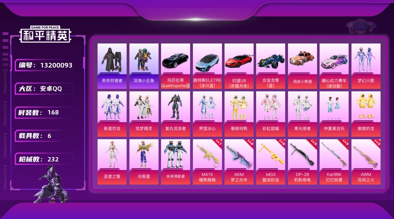 [13200093]安卓 手Q-13粉装-10特效枪-6载具-9粉色飞行器-91051热力值-10王牌印记-168套装-232枪皮 【热门品类】:粉装-梦幻火箭,套装-深海小丑鱼,套装-小丑鱼,套装-奇异狩猎者,角色-军刀雅典娜,套装-龟仙人,套装-暗影哥特,套装-粉红小猪 【粉色载具】:路特斯ELETRE(冰川蓝),玛莎拉蒂Quattroporte(夜幕蓝),仰望U9(赤霞丹朱),合金龙骨(蓝),俏皮小熊猫,糖心拉力赛车(波动紫),僚机-萌兔起飞 【粉色套装】:粉装-梦幻火箭,粉装-新星烈龙,粉装-筑梦精灵,角色-复仇流浪者,粉装-霁雪冰心,粉装-垂柳戏鸭,粉装-彩虹甜喵,粉装-寒光使者,粉装-仲夏莫吉托,粉装-傲傲奶龙,角色-圣堂之誓,角色-光极星,粉装-未来领航者 【粉色枪皮等级】:AKM-梦之光华(六级),M16A4-垂柳戏鸭(四级),SCAR-L-青春物语(四级),M416-暖熊萌萌(七级),Vector-环太平洋(四级),Kar98K-巳巳如意(五级),AWM-花间之火(五级),M249-彩虹甜喵(五级),DP-28-豹影疾电(五级),MG3-酷泡奶龙(六级) 【粉色枪皮】:AKM-梦之光华,M16A4-垂柳戏鸭,SCAR-L-青春物语,M416-暖熊萌萌,Vector-环太平洋,Kar98K-巳巳如意,AWM-花间之火,M249-彩虹甜喵,DP-28-豹影疾电,MG3-酷泡奶龙 【粉色飞行器】:梦幻火箭飞行器,齐天大圣飞行器,天之羽翼飞行器,甜梦小狐飞行器,星夜魔法师飞行翼,闪光银龙飞行器,暖熊萌萌飞行器,璀璨巨星飞行器,萌物绒绒飞行器 【粉色降落伞】:梦幻火箭降落伞,香水柠檬降落伞,甜梦小狐降落伞,环太平洋降落伞,暖熊萌萌降落伞,垂柳戏鸭降落伞,彩虹甜喵降落伞,旋转彩虹降落伞,青空秋雨降落伞,海螺星光降落伞,第五大道降落伞,炎氏战神降落伞,闲梦青缨降落伞,猪猪侠降落伞,金丰海韵降落伞,喜羊羊与灰太狼降落伞 【稀有套装】:套装-龟仙人,套装-巳巳如意,角色-米开朗基罗,角色-灵公主 【稀有枪皮】:AKM-墨染幽兰,AKM-夜灯,AKM-彩虹符号,AKM-王牌投手,AKM-环太平洋,AKM-生命誓言,AKM-破晓战魂,AKM-缤纷海域,AKM-虎虎生威,AKM-霓虹街区,AKM-龙的传人,M16A4-幻世战舞者,M16A4-甜心亚梦,M16A4-红色方程式,SCAR-L-