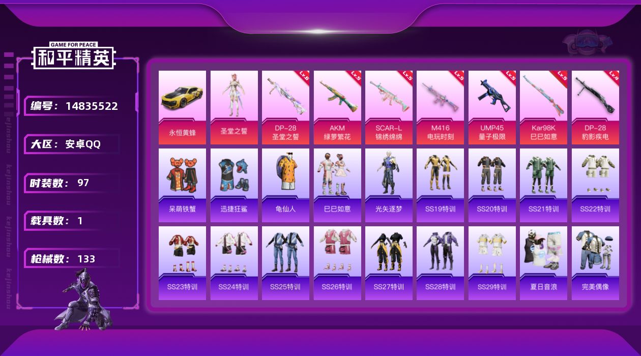 - [12809905]安卓 手Q-1神装-1粉装-3特效枪-2载具-1粉色飞行器-18058热力值-1王牌印记-32套装-46枪皮 【红色神装等级】:最终圣卫者-帕修斯(二级) 【红色角色神装】:最终圣卫者-帕修斯 【粉色载具】:迈凯伦塞纳(冷萃蓝),最终圣卫者摩托车 【粉色套装】:粉装-金丰海韵 【粉色枪皮等级】:Vector-最终圣卫者(三级),P90-金丰海韵(六级),DP-28-豹影疾电(一级) 【粉色枪皮】:Vector-最终圣卫者,P90-金丰海韵,DP-28-豹影疾电 【粉色飞行器】:终晖之翼飞行器 【粉色降落伞】:金丰海韵降落伞,英伦信使降落伞,月影灵韵降落伞,幻彩电音降落伞,双重狂想降落伞,最终圣卫者降落伞,冷漠罗丽降落伞,异瞳寒姬降落伞 【稀有套装】:套装-雏菊兔兔,套装-萝兰蝴蝶,角色-俏兔智灵,套装-极速光影,角色-玫纹锢梦,角色-黯羽织刑,角色-紫俏灵猫 【稀有枪皮】:M16A4-最终圣卫者,SCAR-L-炫彩节奏,AUG-耀粉歌者,QBZ-彩虹符号,M762-天降萌叽,AC-VAL-天降萌叽,UZI-天降萌叽,汤姆逊-天降萌叽,野牛-最终圣卫者,Kar98k-最终圣卫者,M200-爆裂游戏,S686-千金淑猫,M249-彩虹符号,M249-糯团青竹,DP-28-彩虹符号,MG3-幻世战舞者,MG3-第五大道,R45-幻彩电音 【其他套装】:套装-SS29特训,套装-柠萌假日,套装-疯狂小兔子,套装-绯格组合,套装-缤纷果语,套装-耀粉歌者,套装-青玉碎影,套装-湖畔霞光,套装-粉日山川 【营地ID】:1029914882
