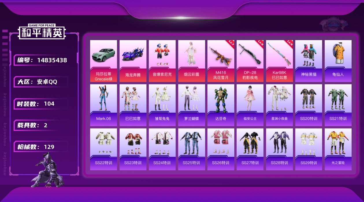 [14835438]【店主推荐捡漏号!可直接换绑】地铁满天赋 素材身法号安卓 手Q-2粉装-3特效枪-2载具-2粉色飞行器-4.3w热力值-5王牌印记-104套装-129枪皮