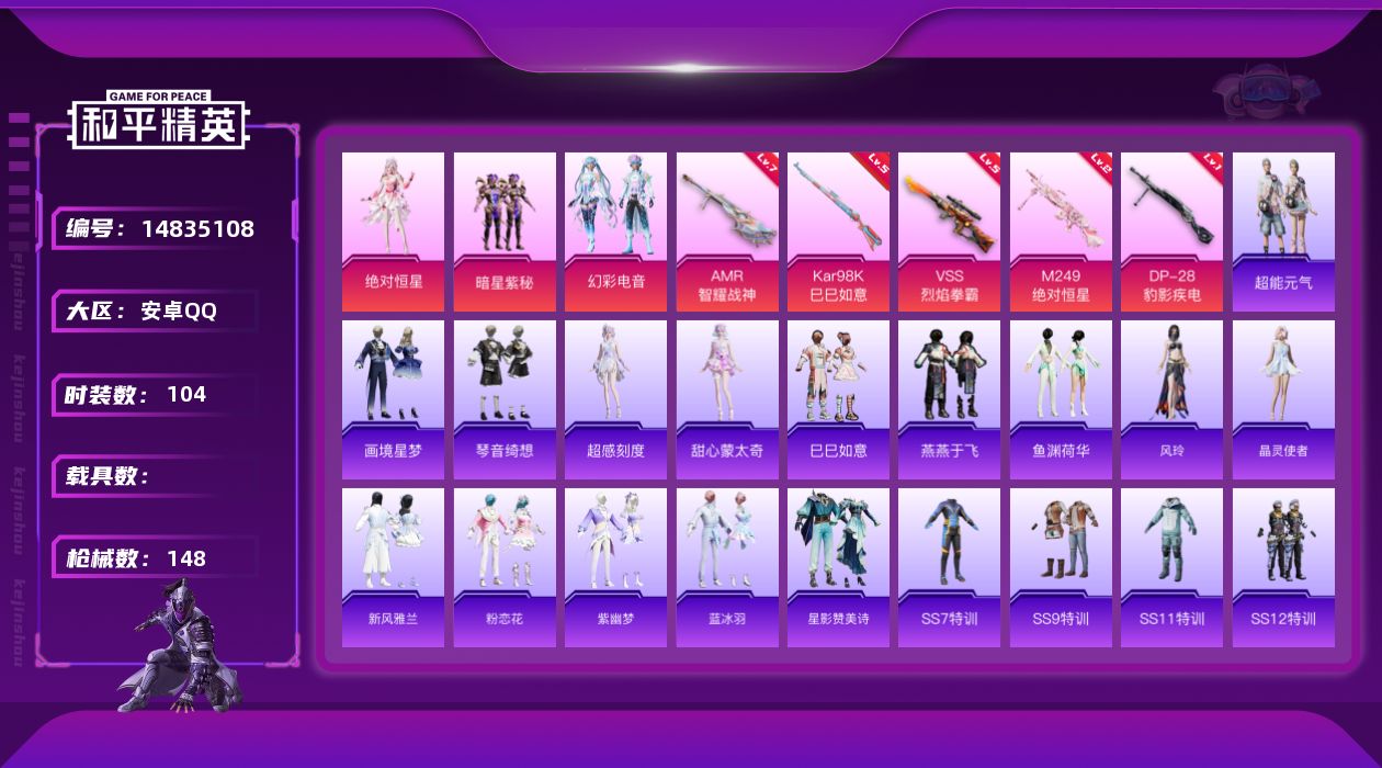 [14835108]【店主推荐捡漏号!可直接换绑】安卓 手Q-3粉装-5特效枪-0载具-1粉色飞行器-43572热力值-4王牌印记-104套装-148枪皮 【粉色套装】:角色-绝对恒星,粉装-暗星紫秘,粉装-幻彩电音 【粉色枪皮等级】:Kar98K-巳巳如意(五级),VSS-烈焰拳霸(五级),AMR-智耀战神(七级),M249-绝对恒星(二级),DP-28-豹影疾电(一级) 【粉色枪皮】:Kar98K-巳巳如意,VSS-烈焰拳霸,AMR-智耀战神,M249-绝对恒星,DP-28-豹影疾电 【粉色飞行器】:绝对恒星飞行器 【粉色降落伞】:绝对恒星降落伞,春暖花开降落伞,四圣焕新降落伞,绚金瑰梦降落伞,暗星紫秘降落伞,晶梦幻蝶降落伞,星穹咏叹调降落伞,极意拳锋降落伞 【稀有套装】:套装-巳巳如意,套装-超能元气,角色-超感刻度,角色-甜心蒙太奇,套装-雪国风尚,套装-燕燕于飞,套装-鱼渊荷华,角色-风玲,套装-晶灵使者,套装-新风雅兰,套装-粉恋花,套装-紫幽梦,套装-蓝冰羽,套装-星影赞美诗,套装-画境星梦,套装-琴音绮想 【稀有枪皮】:AKM-夜灯,AKM-彩虹符号,AKM-星之信仰,AKM-萌趣颜团子,AKM-虎虎生威,AKM-霓虹街区,M16A4-幻世战舞者,SCAR-L-炫彩节奏,SCAR-L-碧影闪光,M416-夜灯,M416-紫翼圣骑,M416-红色方程式,GROZA-异彩先驱,GROZA-彩虹符号,GROZA-恐龙拽拽,GROZA-蓝莓炮弹,AUG-耀粉歌者,AUG-绝对恒星,QBZ-原初圣火,QBZ-彩虹符号,QBZ-神秘黑猫,QBZ-绚金瑰梦,QBZ-赛罗,QBZ-飞驰魅影,M762-天星战神,M762-牛气冲天,M762-瑞龙福将,G36C-星穹咏叹调,AC-VAL-天降萌叽,ACE32-画境星梦,UZI-众神之王,UZI-啾咪啾咪,UMP45-夜灯,UMP45-生命誓言,Vector-PEL轰鸣竞梦者,Vector-彩虹符号,Vector-暗夜玫瑰,Vector-生命誓言,Vector-动力核心,汤姆逊-天降萌叽,汤姆逊-庄周梦蝶,汤姆逊-异彩先驱,汤姆逊-炫彩节奏,汤姆逊-耀粉歌者,汤姆逊-智耀战神,野牛-夜灯,MP5K-众神之王,MP5K-异彩先驱,MP5K-蓝莓炮弹,MP5K-画境星梦,P90-飞驰魅影,P90-巳巳如意,Kar98K-彩虹符号,Kar98K