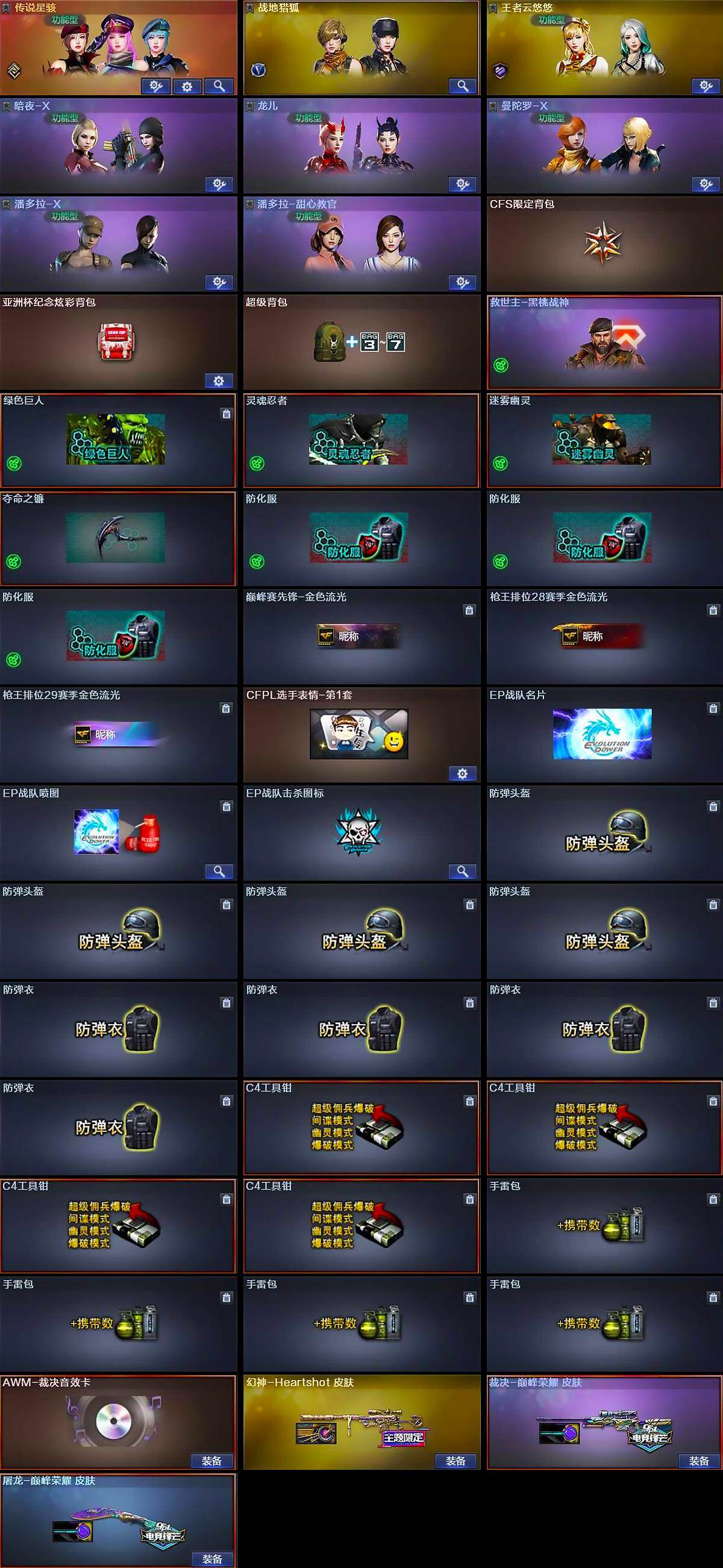 - [9778539]实名: 可修改 时装数: 815 枪械数: 219 战备数: 168 热门装扮: 梦幻火箭(新101),极限特训,怪诞乔克,宝贝奶油派,放客神游,鹰眼刺客,缤纷油彩,粉色回忆,都市猎人,香水柠檬,炙焰红王,花间之火,冰霜白皇,虎啸骄阳,迪迦闪耀型,零号机款机体服,初号机款机体服,2号机款机体服,甜梦小狐,暖熊萌萌,灵感创作师,冰川幽秘,动感兔斯基,音爆索尼克,赤蝎幽灵,派对舞王,萨利娅 稀有枪皮: MG3洛神天依,Vector红伞翩翩,AKM甜心宝贝,M416心之恋语,SCAR-L童趣迷兔,Groza香水柠檬,DP-28枪炮玫瑰,M416暖熊萌萌,SPAS-12音爆索尼克,平底锅林间仙鹿,Kar98K-巳巳如意,MK12-雪月幻音