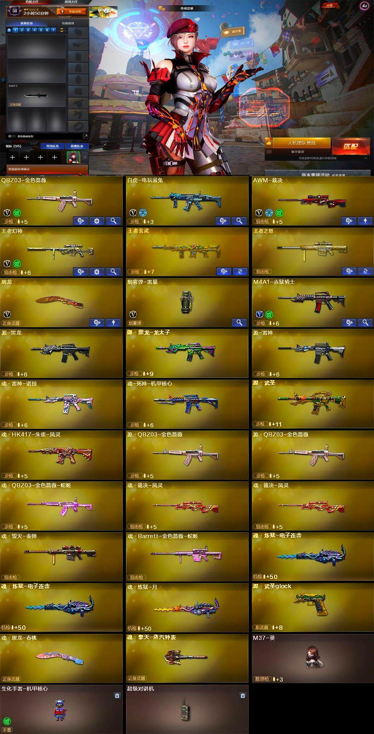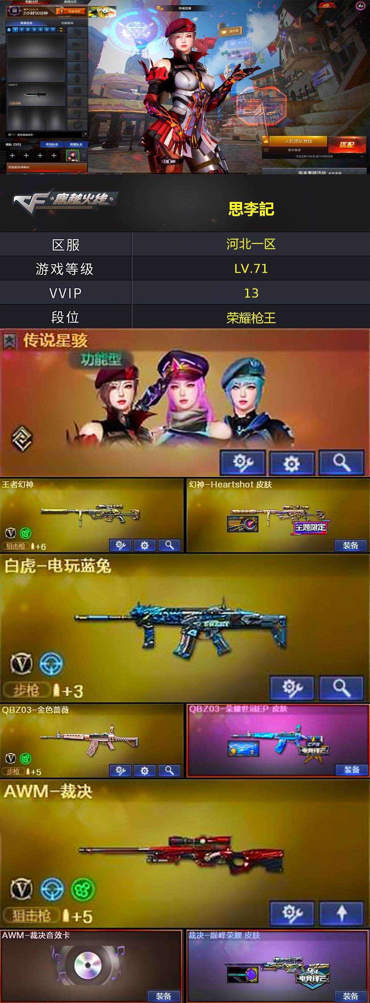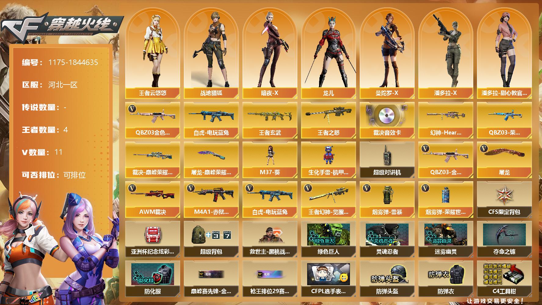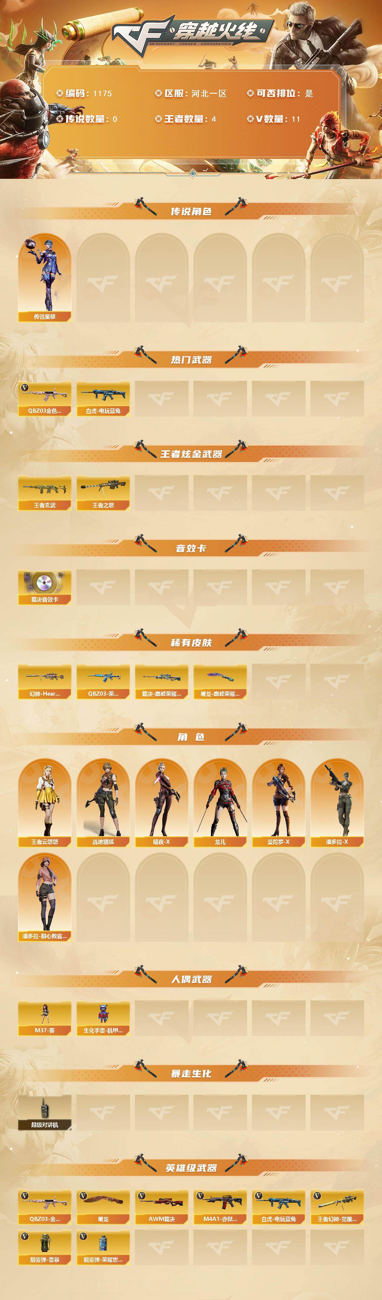 [14981960]河北一区-11V-4王者-0炫金 【传说角色】:传说星骇 【热门武器】:QBZ03-金色蔷薇,白虎-电玩蓝兔 【王者炫金武器】:王者玄武,王者之怒 【音效卡】:AWM-裁决音效卡 【皮肤】:幻神-Heartshot 皮肤,QBZ03-荣耀世冠EP 皮肤,裁决-巅峰荣耀 皮肤,屠龙-巅峰荣耀 皮肤 【角色】:战地猎狐,王者云悠悠,暗夜-X,龙儿,曼陀罗-X,潘多拉-X,潘多拉-甜心教官 【人偶武