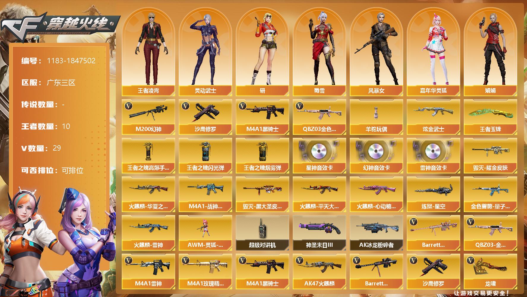 - [14387161]江苏一区-36V-7王者-0炫金 【热门武器】:HK417-朱雀,M200-竞技荣光,毒蜂,金色蔷薇-空,羊驼玩偶,沙鹰-修罗*2 【王者炫金武器】:王者凤吟 【音效卡】:Barrett-极光音效卡,HK417-朱雀音效卡,Barrett-碧霄极光音效卡*2 【皮肤】:雷神-航星皮肤,黑龙-能量核心,修罗-能量核心 【角色】:电竞教官-云悠悠,乔伊教练,修道士,云海玲珑,北极狐-X,初恋灵狐,虎妞,嘉年华灵狐,娟娟,灵狐者-职业经理,麻雀,潘多拉-X,青霞仙子,斯沃特-X,蜀雪,新娜塔莎,雪莉杨-摸金校尉,影武者-X 【人偶武器】:金色蔷薇-空,AWM-灵狐-15周年嘉年华,夺魂,迷你生化手雷,生化手雷-机甲核心 【暴走生化】:毒蜂 【挑战大师】:暴君乱世-超越Max,激光毁灭者III,神圣爆裂者-末日III 【英雄级武器】:AK47-火麒麟,M4A1-雷神,AK47-黑鲨,HK417-朱雀,无影-神兵利器,烈火-动感闪耀,超新星-悦享-觉醒版,王者芳薇-觉醒版,AWM-天龙,Barrett-毁灭,Barrett-极光,M200-竞技荣光,王者风神-觉醒版,王者凰鸣-觉醒版,沙鹰-修罗*2,COP-雷霆,柯尔特-竞技荣光,天神-动感闪耀,屠龙,擎天-竞技荣光*2,屠龙-动感闪耀,王者之击-觉醒版,高爆手雷-竞技荣光*5,手雷-动感闪耀,闪光弹-竞技荣光*5,闪光弹-雷霆王者-觉醒版,烟雾弹-竞技荣光*5,M4A1-赤狱骑士 【道具】:CFS限定背包,女皇终结者-背包,炫彩背包,老虎背包,超级背包,哔哩哔哩名片,女皇终结者-魔龙之吻,绿色巨人,灵魂忍者,迷雾幽灵,夺命之镰,防化服*2,金色流光-枪王排位*2,星辰流光-枪王排位,流光-鎏金之域,枪王排位28赛季金色流光,枪王排位29赛季金色流光,动感闪耀表情,EP战队名片,EP战队喷图,EP战队击杀图标,防弹头盔*7,防弹衣*7,C4工具钳*7,手雷包*7 【特殊枪械】: