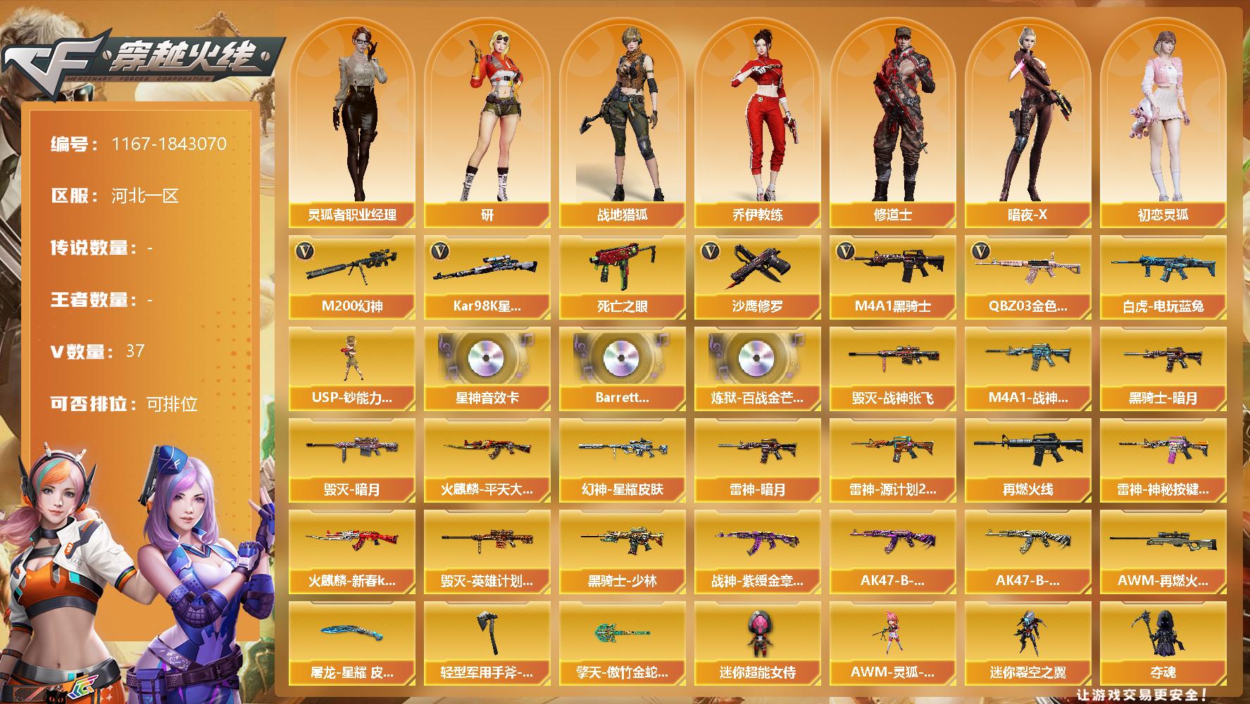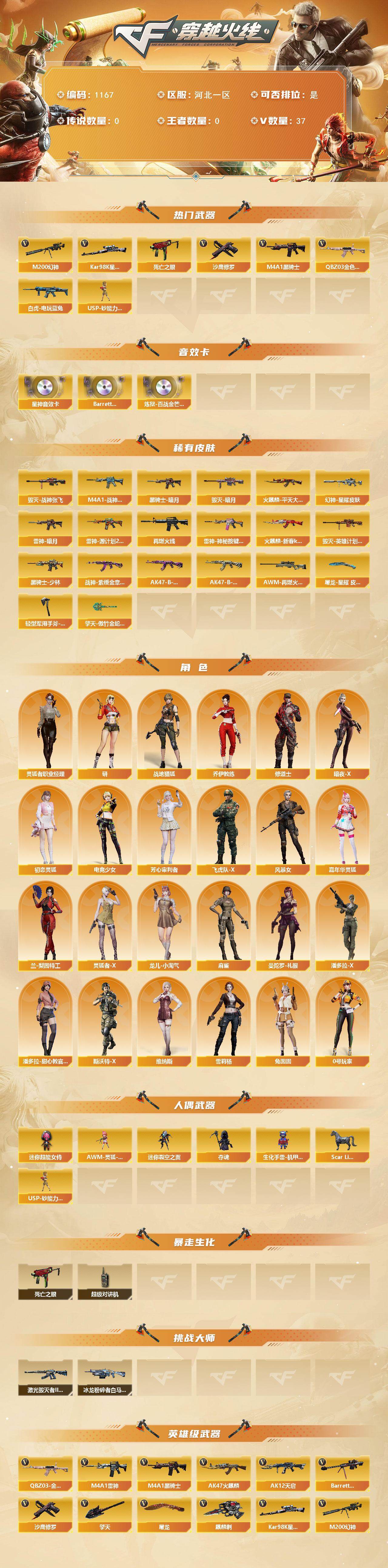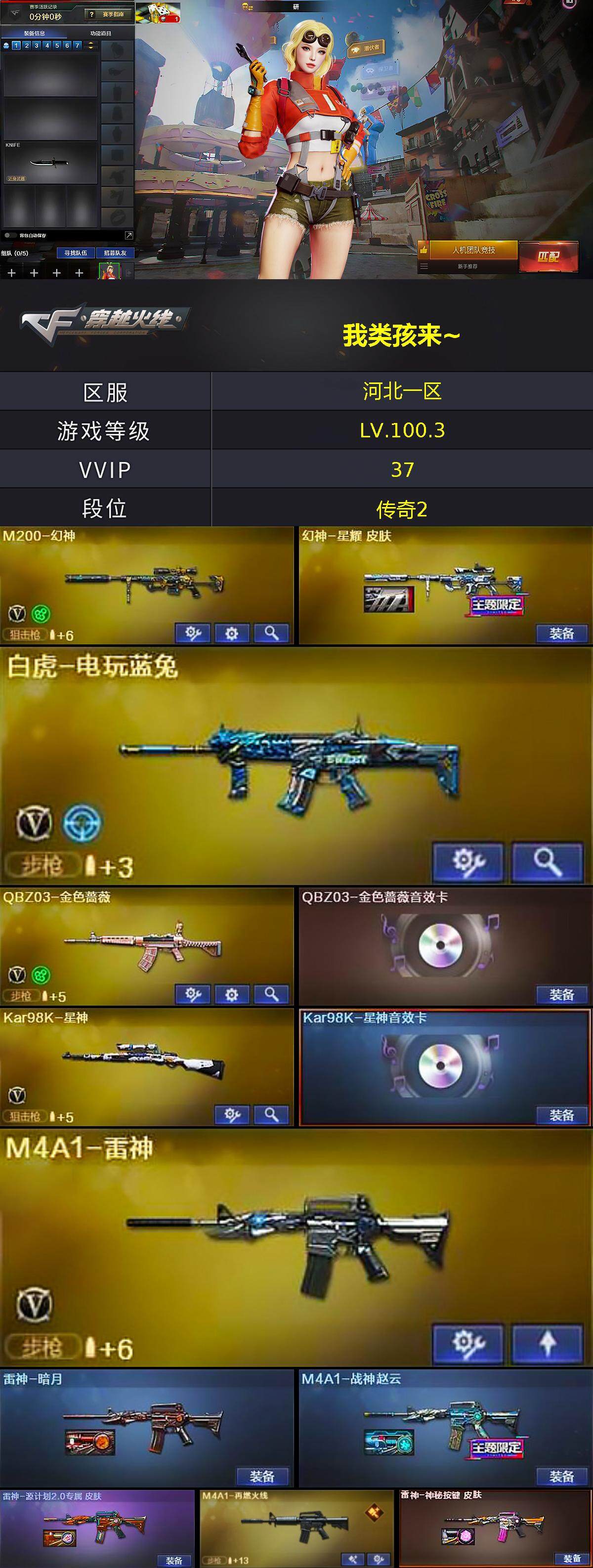 [14983874]河北一区-37V-0王者-0炫金 【热门武器】:QBZ03-金色蔷薇,M200-幻神,死亡之眼,白虎-电玩蓝兔,Kar98K-星神,M4A1-黑骑士,USP-钞能力灵狐,沙鹰-修罗*6 【音效卡】:Kar98K-星神音效卡,Barrett-碧霄极光音效卡,炼狱-百战金芒-庆典舞曲音效卡 【皮肤】:幻神-星耀 皮肤,雷神-暗月,M4A1-战神赵云,雷神-源计划2.0专属 皮肤,M4A1-再燃火线