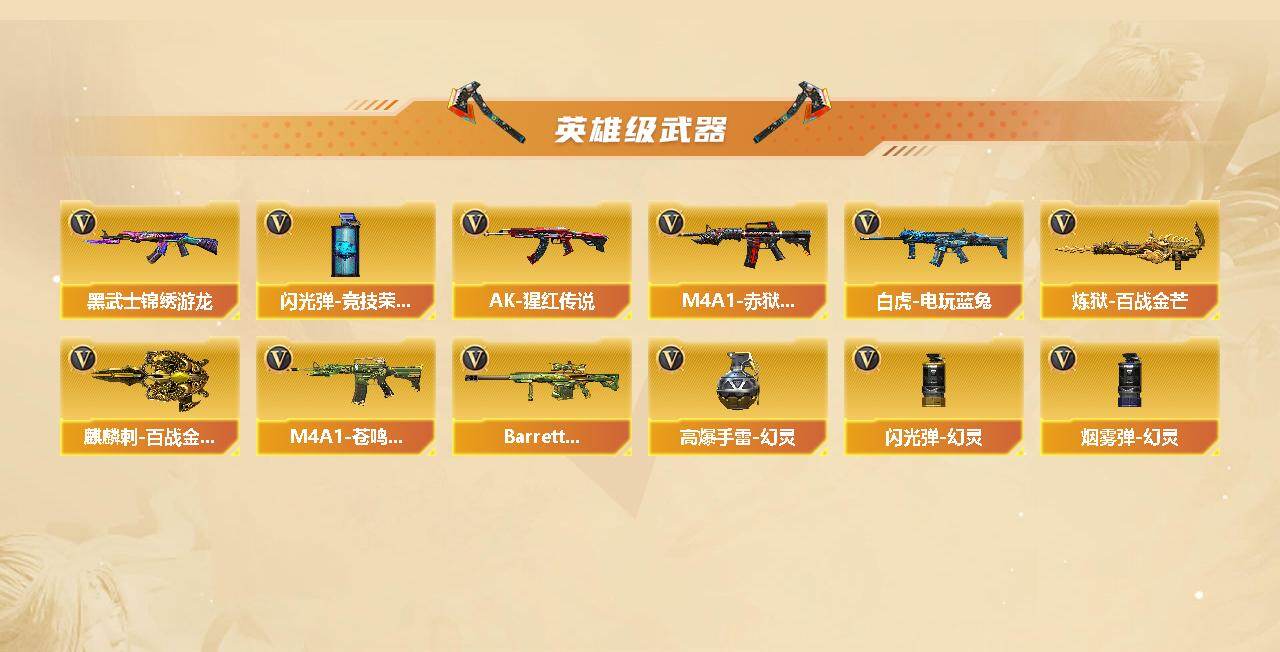 【热门武器】:QBZ03-金色蔷薇,M200-幻神,死亡之眼,白虎-电玩蓝兔,Kar98K-星神,M4A1-黑骑士,USP-钞能力灵狐,沙鹰-修罗*6