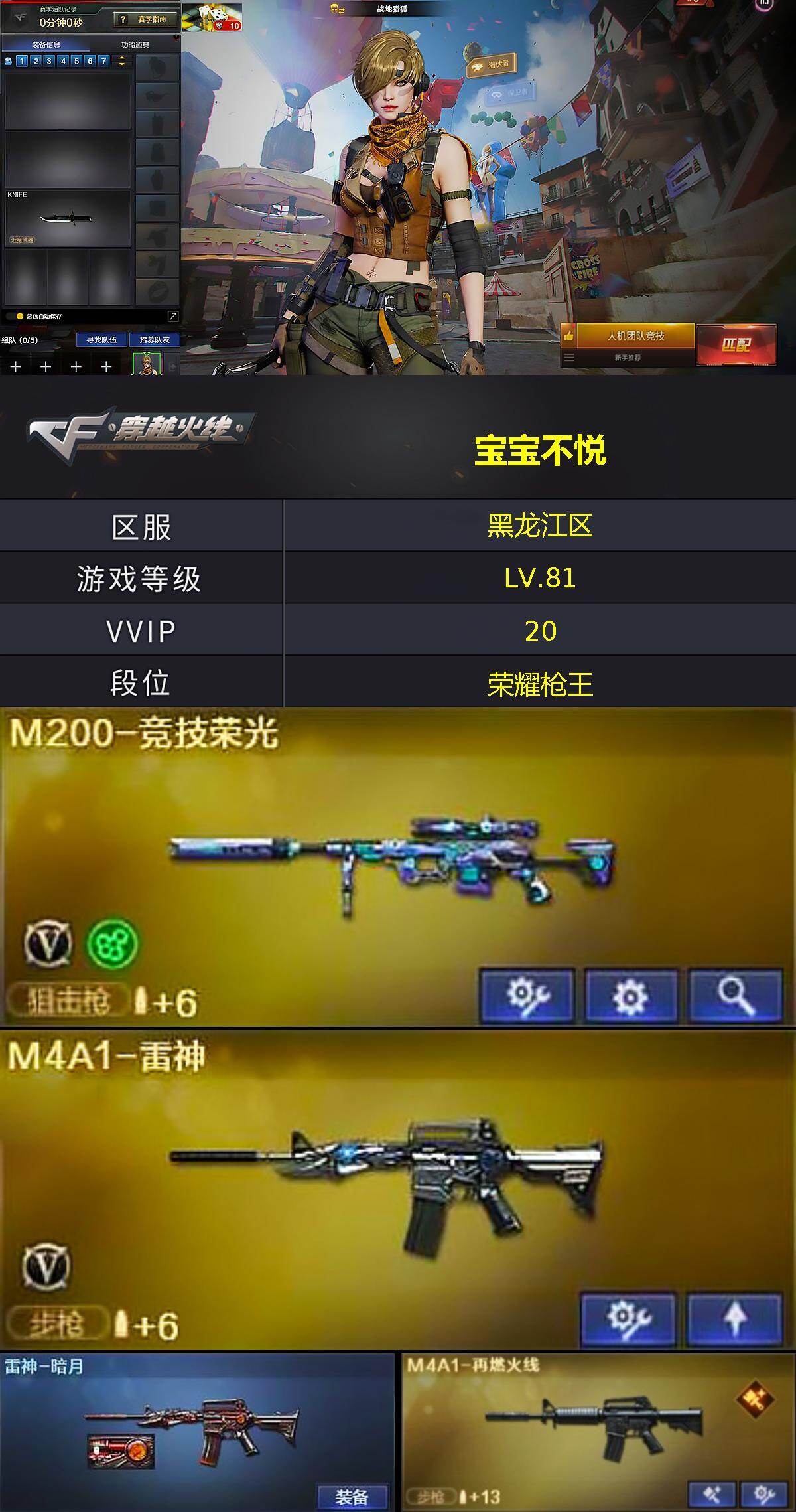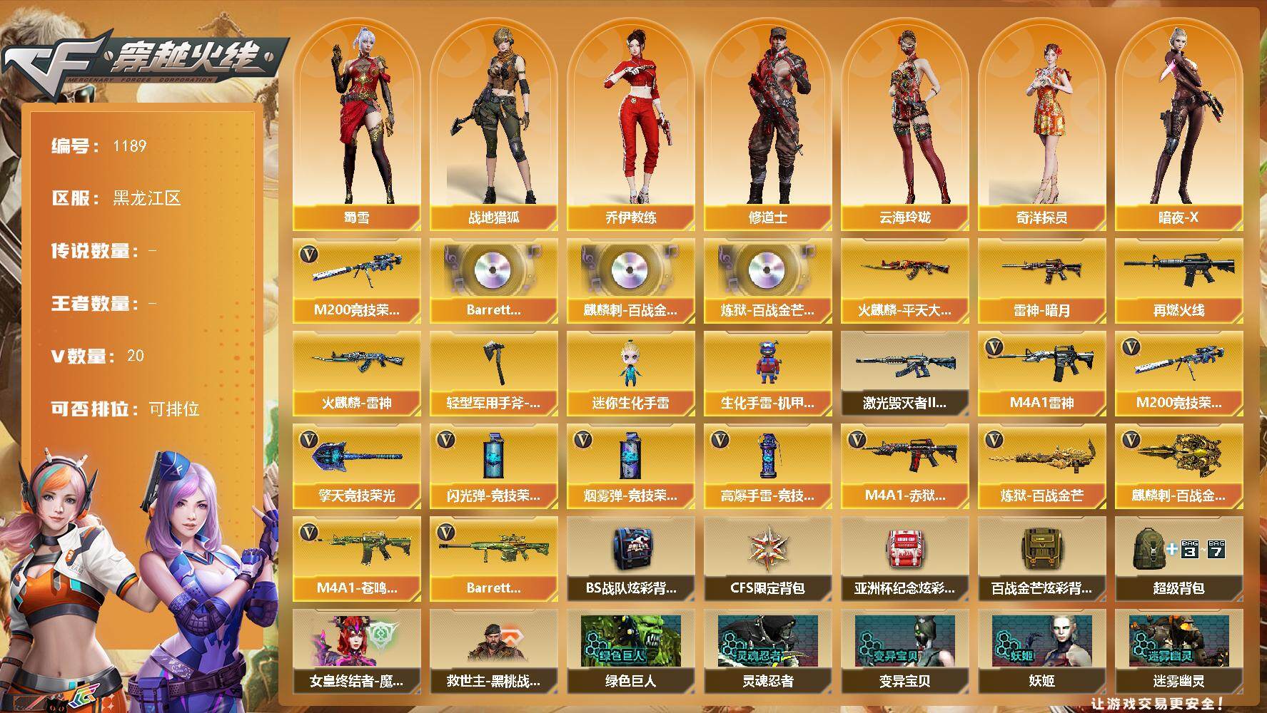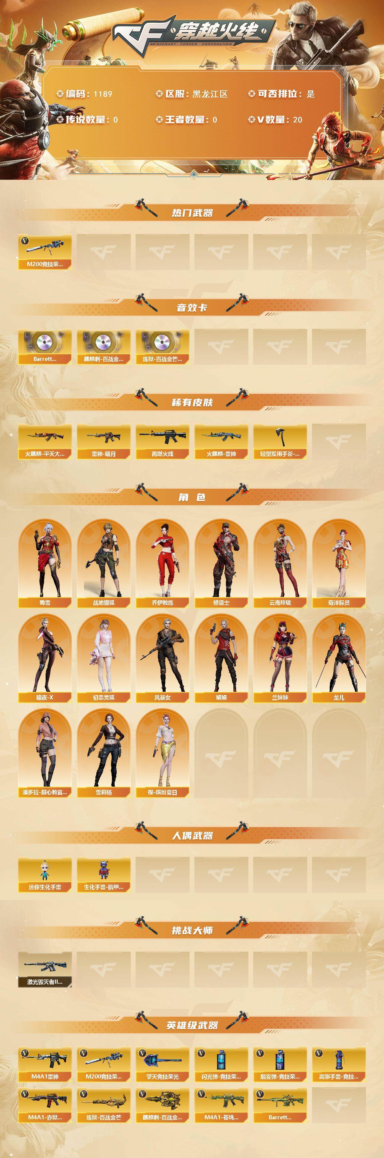 [14983999]黑龙江区-20V-0王者-0炫金 【热门武器】:M200-竞技荣光 【音效卡】:Barrett-碧霄极光音效卡*2,麒麟刺-百战金芒-盛典舞曲音效卡,炼狱-百战金芒-庆典舞曲音效卡 【皮肤】:雷神-暗月,M4A1-再燃火线,火麒麟-雷神,火麒麟-平天大圣,轻型军用手斧-再燃火线 【角色】:战地猎狐,奇洋探员,乔伊教练,修道士,云海玲珑,暗夜-X,初恋灵狐,风暴女,娟娟,兰妹妹,龙儿,潘多拉-甜心教官,蜀雪,雪莉杨,樱-缤纷夏日 【人偶武器】:迷你生化手雷,生化手雷-机甲核心 【挑战大师】:激光毁灭者III-白马银枪 【英雄级武器】:M4A1-雷神,M200-竞技荣光,炼狱-百战金芒,擎天-竞技荣光,麒麟刺-百战金芒,高爆手雷-竞技荣光*3,闪光弹-竞技荣光*2,烟雾弹-竞技荣光*4,M4A1-赤狱骑士,M4A1-苍鸣雷神,Barrett-碧霄极光 【道具】:BS战队炫彩背包,CFS限定背包,亚洲杯纪念炫彩背包,百战金芒炫彩背包,超级背包,女皇终结者-魔龙之吻,救世主-黑桃战神,绿色巨人,灵魂忍者*2,变异宝贝,妖姬,迷雾幽灵*2,夺命之镰,防化服*3,流光-鎏金之域,流光-再燃火线,枪王排位29赛季金色流光,语音特效-盛典烟火,萌萌小葵表情,电玩兔兔表情,C4-再燃火线,防弹头盔*3,防弹衣*3,C4工具钳*3,手雷包*3 【特殊枪械】: