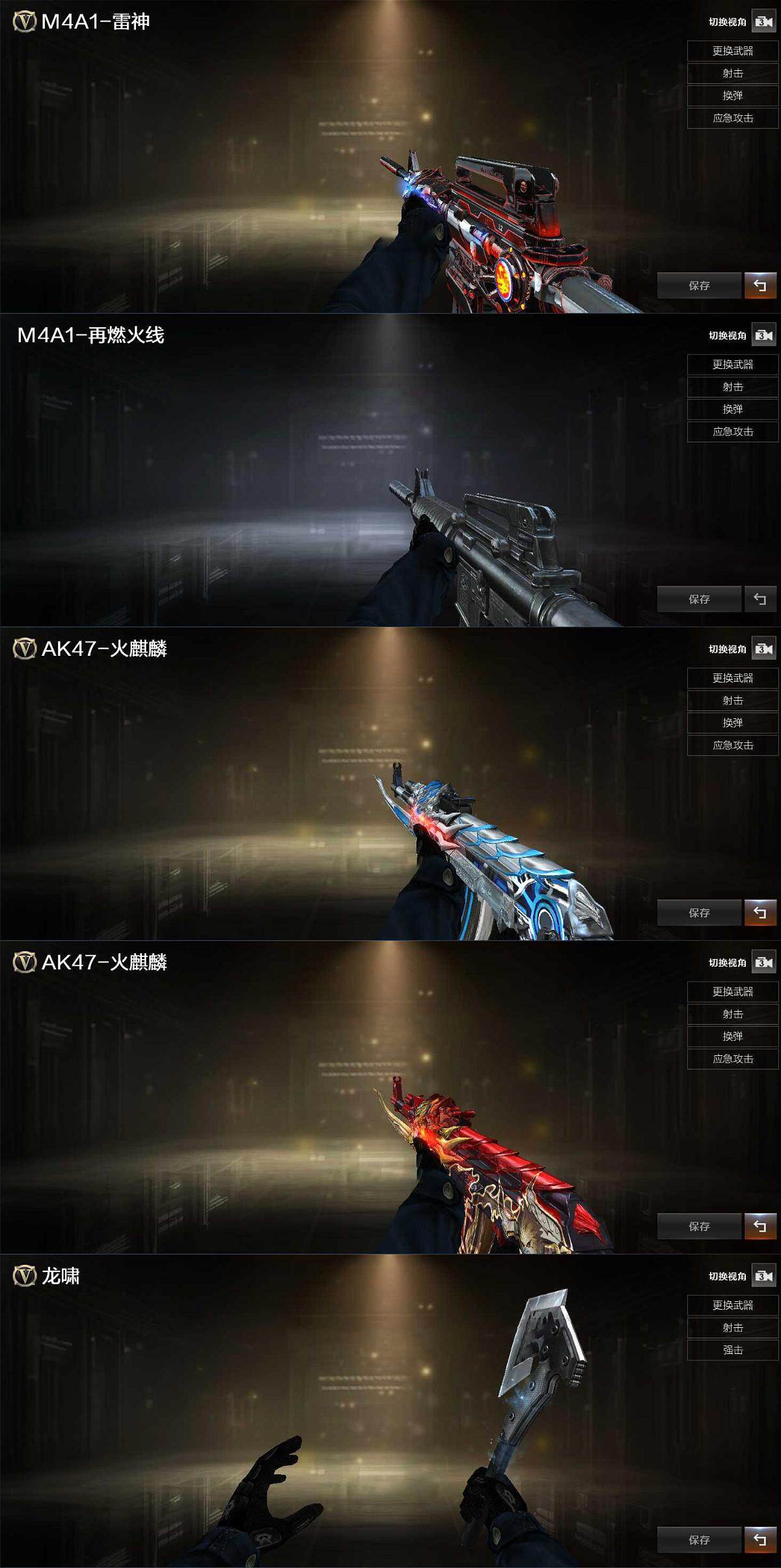 【皮肤】:雷神-暗月,M4A1-再燃火线,火麒麟-雷神,火麒麟-平天大圣,轻型军用手斧-再燃火线