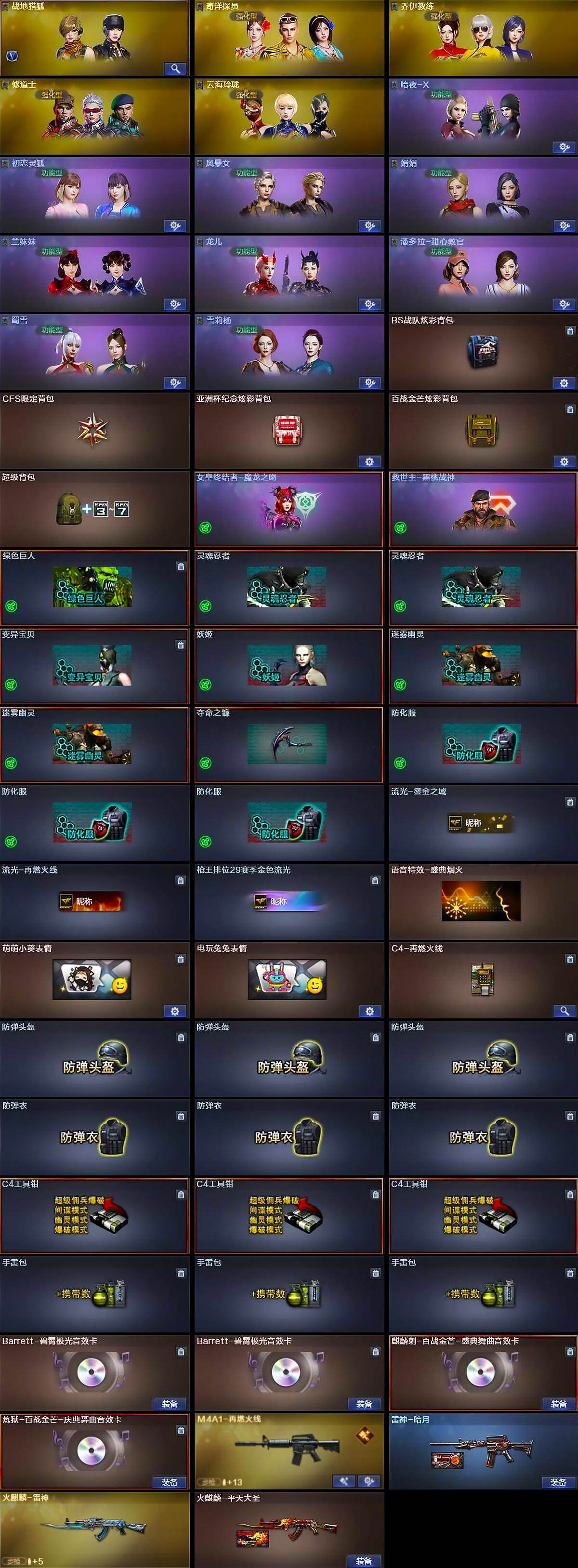 【道具】:BS战队炫彩背包,CFS限定背包,亚洲杯纪念炫彩背包,百战金芒炫彩背包,超级背包,女皇终结者-魔龙之吻,救世主-黑桃战神,绿色巨人,灵魂忍者*2,变异宝贝,妖姬,迷雾幽灵*2,夺命之镰,防化服*3,流光-鎏金之域,流光-再燃火线,枪王排位29赛季金色流光,语音特效-盛典烟火,萌萌小葵表情,电玩兔兔表情,C4-再燃火线,防弹头盔*3,防弹衣*3,C4工具钳*3,手雷包*3
