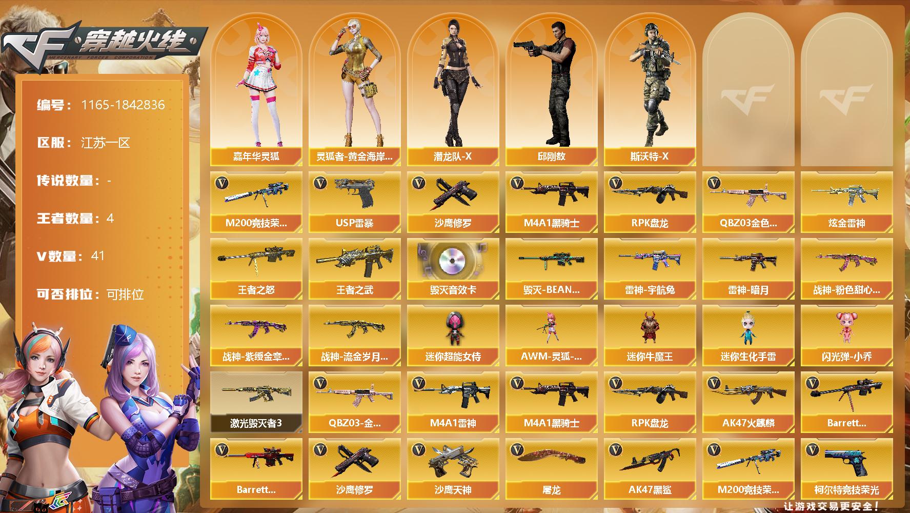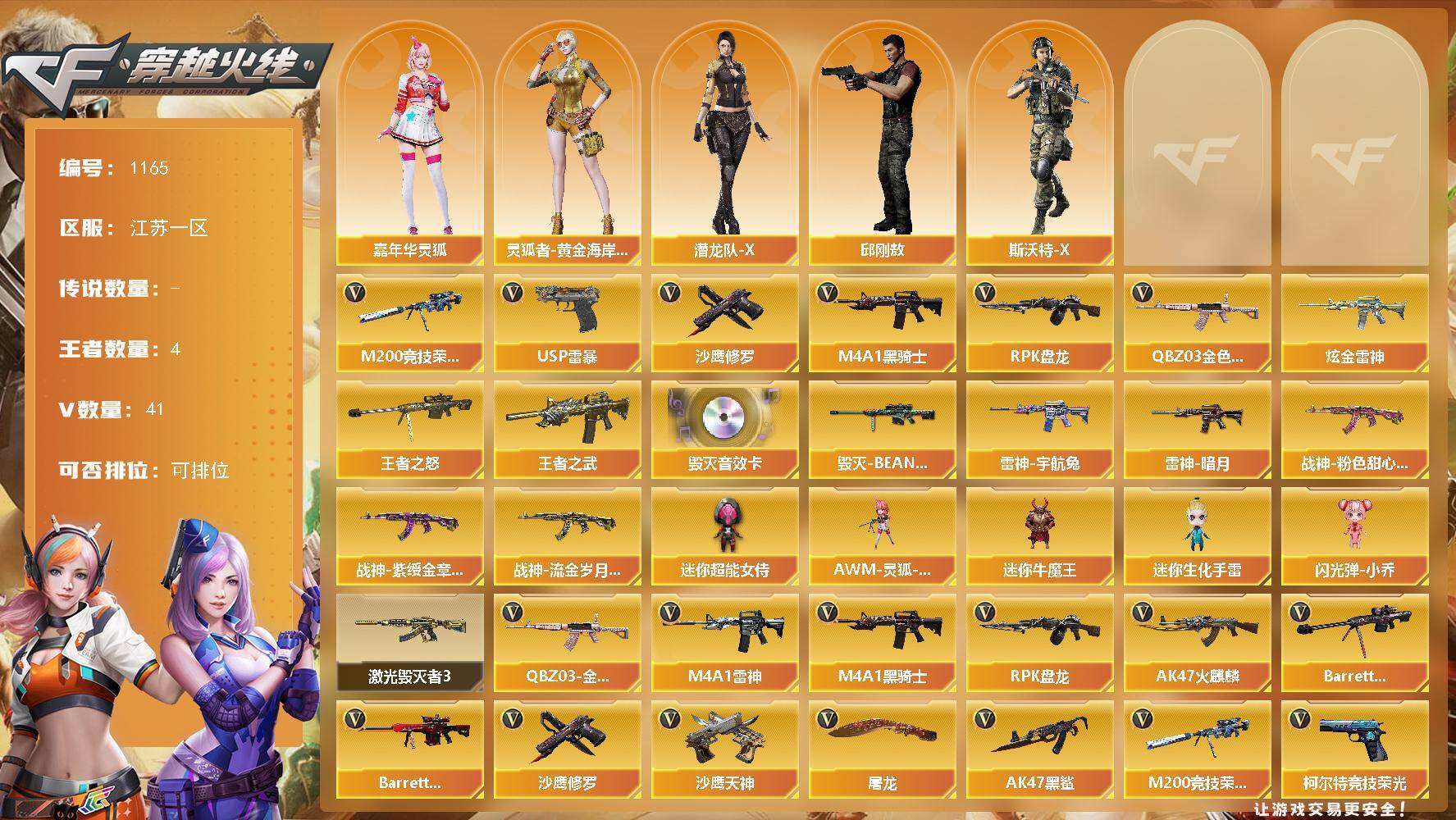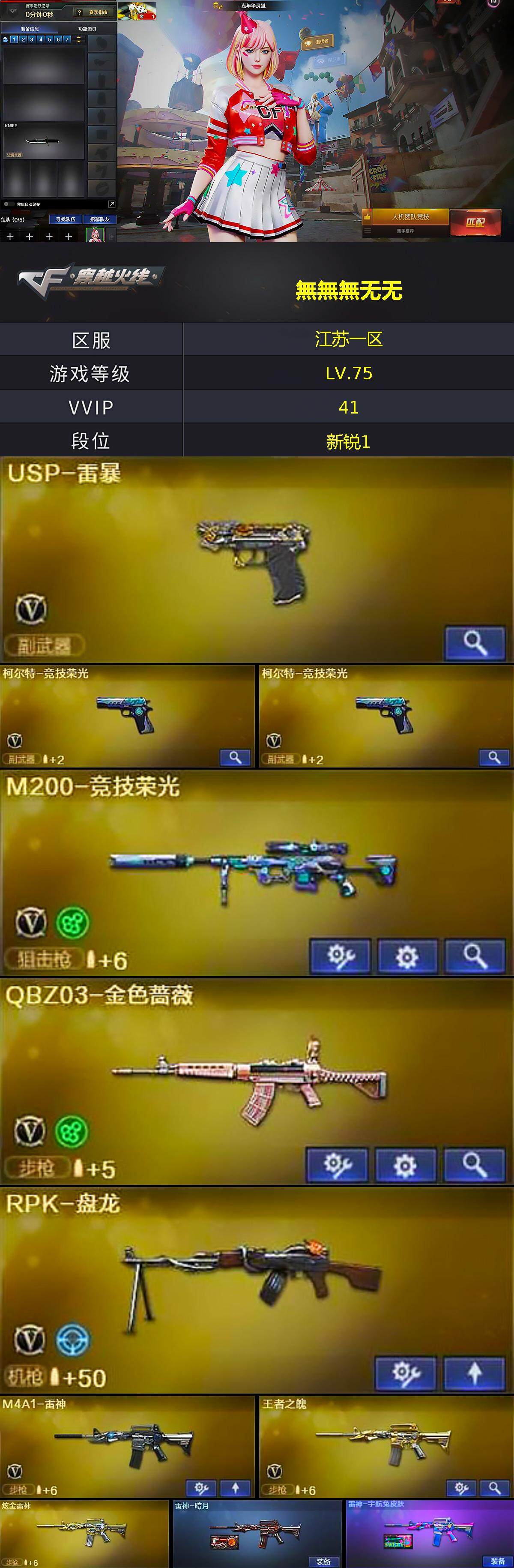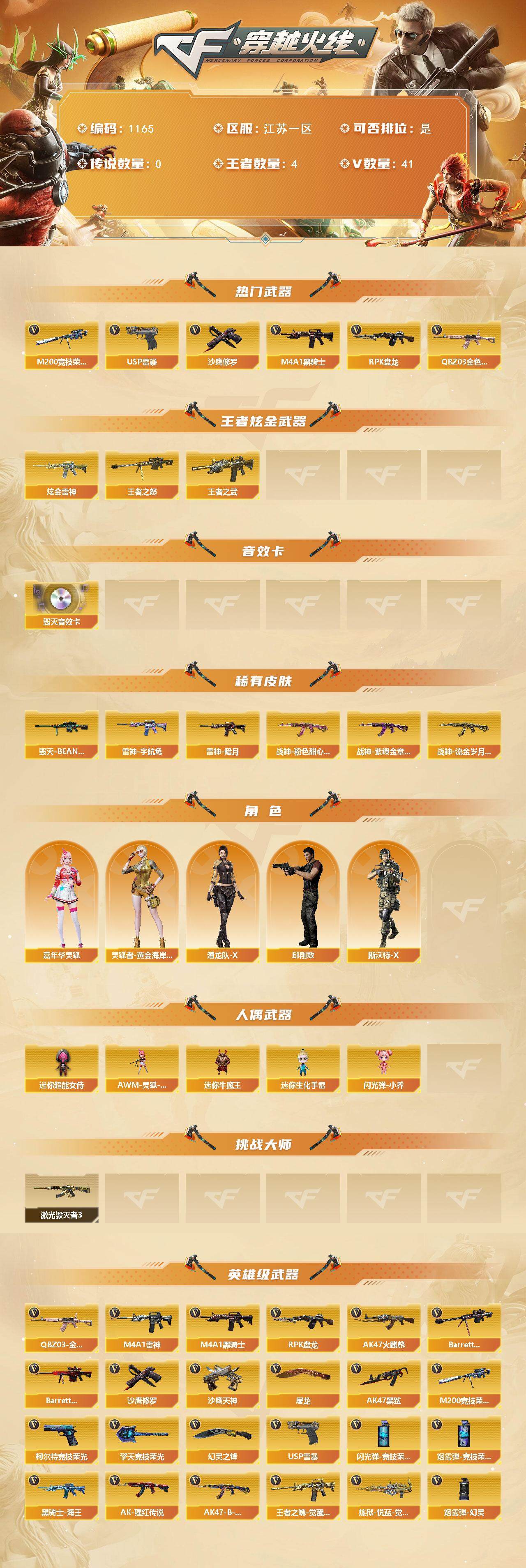 [14984310]江苏一区-41V-4王者-1炫金 【热门武器】:QBZ03-金色蔷薇,M200-竞技荣光,M4A1-黑骑士*2,RPK-盘龙,USP-雷暴,沙鹰-修罗*3 【王者炫金武器】:王者之武,王者之怒,炫金雷神 【音效卡】:Barrett-毁灭音效卡 【皮肤】:雷神-暗月,雷神-宇航兔皮肤,毁灭-BEAN-2020MVP,战神-粉色甜心皮肤*2,战神-紫绶金章皮肤*2,战神-流金岁月皮肤*2 【角色】