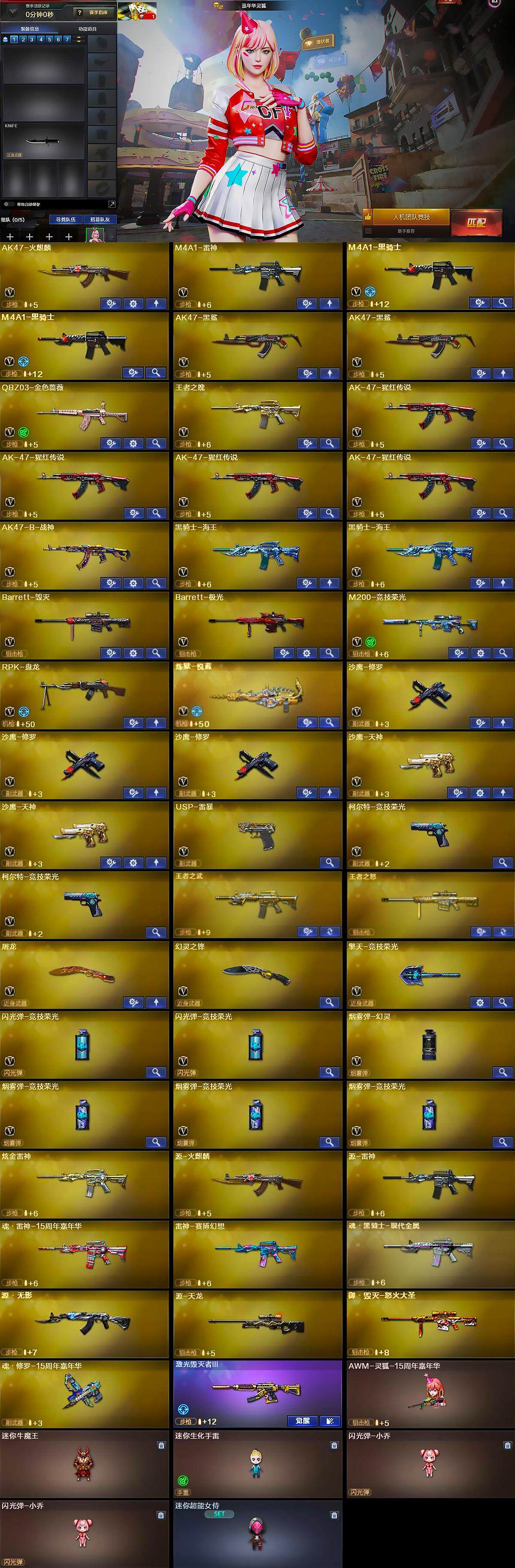 - [11608917]7粉装 3特效枪 8印记 可二次 可修改实名 身法装备:都市猎人 优质装备:都市猎人,宝贝奶油派,SCAR-L-锦绣绵绵,智耀战神,Kar98K-巳巳如意 热门装扮:未来歌姬,水仙星,暖暖奶龙,圣堂之誓,守护天翼,都市猎人 稀有枪皮:DP-28-豹影疾电 五级特效枪:五级Kar98K-巳巳如意,五级DP-28-豹影疾电,五级SCAR-L-锦绣绵绵 紫色装扮:SS22特训,SS23特训,娇憨猪猪,酸甜橘柚,萌趣咩咩,SS21特训,SS31特训套装,人气偶像,冰川特警,冷焰舞者,极速光影,SS30特训套装,云朵鹅,雪绒豹,SS33特训套装,SS20特训,猎梦纪元,SS19特训,军刀雅典娜,豚鼠丹丹,浑天鲲鹏,甜心亚梦,虚音幻奏,雪兔飞飞,都市魅力,酒红色名流,长空猛禽,霓虹街区,青年教官,荣耀,荧惑魅影,蓝彩潮人,蓝色运动,街头潮人,魅力单车,麻辣教官,黄色伏地魔,黄色名流,黄色运动,黎明保卫者,黑色伏地魔,龙的传人,龟仙人,冰河战士,蝶变,极地朋克,极速红龙,柠萌假日,橘黑制服,海岛探路者,涂山之恋,深蓝色名流,清新柠檬,夏日倾情,夏日音浪,完美偶像,帅气教官,幻世战舞者,战地督导,探宝勇士,湖蓝色名流,绮丽涂鸦,白色伏地魔,破蛋小黄鸡,空岛之星,竞技达人朋克,红色运动,王牌教练,牛气冲天,灼焰舞者,炫蓝之夏,热血青春,牛气满满,猛禽,猎鹰,小熊娃娃,雏菊兔兔,萝兰蝴蝶,SS29特训,先驱飞行员,白光莹,纯真浪花,热情海星,SS28特训,暗影刺翼,石蕴玉辉,鱼渊荷华,玉兔迎春,燕燕于飞,巳巳如意,海琴烟,都市丽猫,青团波波,糖糖葫芦,竞技名士,绒宝小鹅,摩登魅猫,街头风暴,果汁能量,惊鸿侠骨,甜梦熊熊,神气柴柴,懵萌河马,SS24特训(SS24特训套装),萤火魅影(套装-荧惑魅影),SS25特训,绝对偶像,锦衣飞扬,粉红小猪,焰鹰斗篷,幻羽潜行,幽夜迷踪,SS27特训,明鸳圣池,浪漫天命,SS26特训,春光漫游,快闪甜心,贝斯之夜,智谋强哥,晶辉守护,精神漫游,大橘大利,耀粉歌者,春日漫步,蓝冰羽,紫幽梦,SS32特训服(SS32特训套装),瑰梦爱神,青玉碎影,绯格组合,恋语绒绒,金耀舞者,光之冒险 优质战备:创世·救赎降落伞,精灵梦叶罗丽降落伞,星途旅人降落伞,宇宙意志降落伞,江南烟雨降落伞,猪猪侠降落伞,幻彩电音降落伞,冷漠罗丽降落伞,环太平洋降落伞,纯梦嫁纱降落