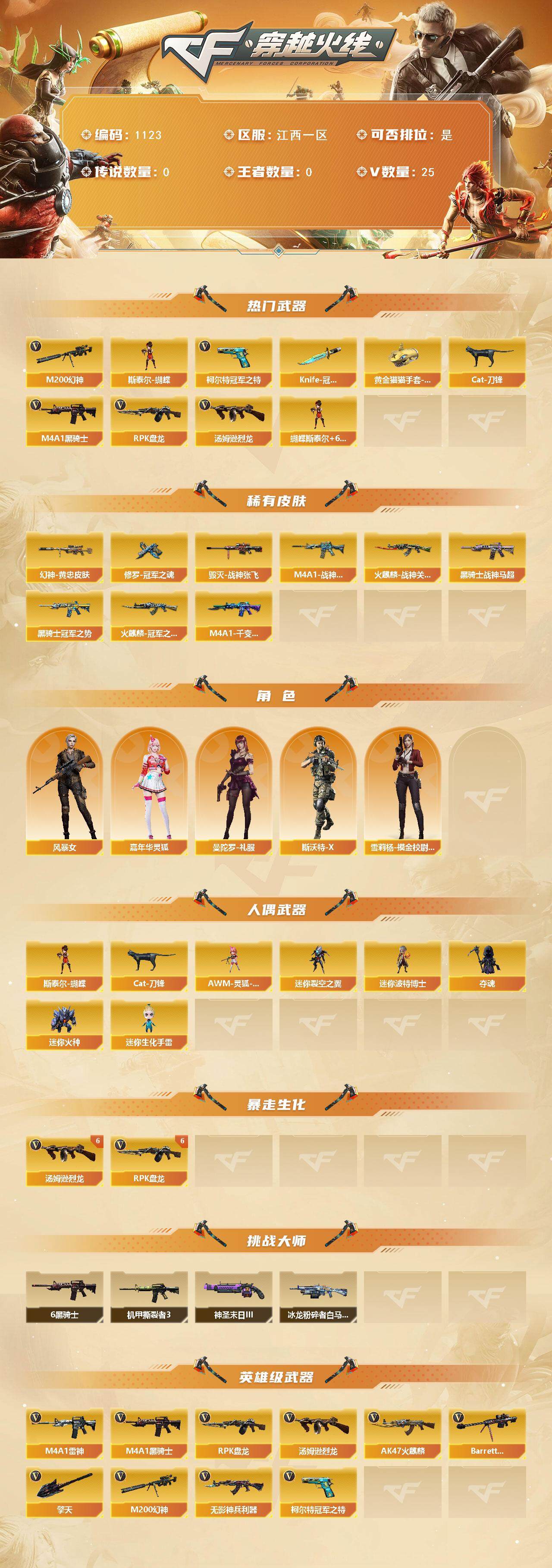 [14984337]江西一区-25V-0王者-0炫金 【热门武器】:M200-幻神,柯尔特-冠军之特,Cat-刀锋,M4A1-黑骑士*6,汤姆逊-烈龙*6,RPK-盘龙*6,斯泰尔-蝴蝶,Knife-冠军之刃,黄金猫猫手套-白鲨 【皮肤】:M200-幻神-黄忠皮肤,M4A1-战神赵云,火麒麟-冠军之心,火麒麟-战神关羽,毁灭-战神张飞,M4A1-千变-孔明皮肤,黑骑士-冠军之势,黑骑士-战神马超,修罗-冠军之魂 【角色】:风暴女,嘉年华灵狐,曼陀罗-礼服,斯沃特-X,雪莉杨-摸金校尉 【人偶武器】:斯泰尔-蝴蝶,AWM-灵狐-15周年嘉年华,Cat-刀锋,迷你裂空之翼*2,迷你波特博士*3,夺魂,迷你火种*2,迷你生化手雷 【挑战大师】:冰龙粉碎者-白马银枪,机甲撕裂者III,神圣爆裂者-末日III 【英雄级武器】:AK47-火麒麟,M4A1-雷神,M4A1-黑骑士*6,无影-神兵利器,Barrett-毁灭,M200-幻神,RPK-盘龙*6,汤姆逊-烈龙*6,柯尔特-冠军之特,擎天 【道具】:XROCK炫彩背包,全能枪王背包,炫彩背包,夺命之镰,防化服,金色流光-枪王排位*2,枪王排位29赛季金色流光,防弹头盔*3,防弹衣*3,C4工具钳*3,手雷包*3 【特殊枪械】:蝴蝶斯泰尔+6烈龙,6黑骑士,6烈龙,6盘龙,1蝴蝶斯泰尔