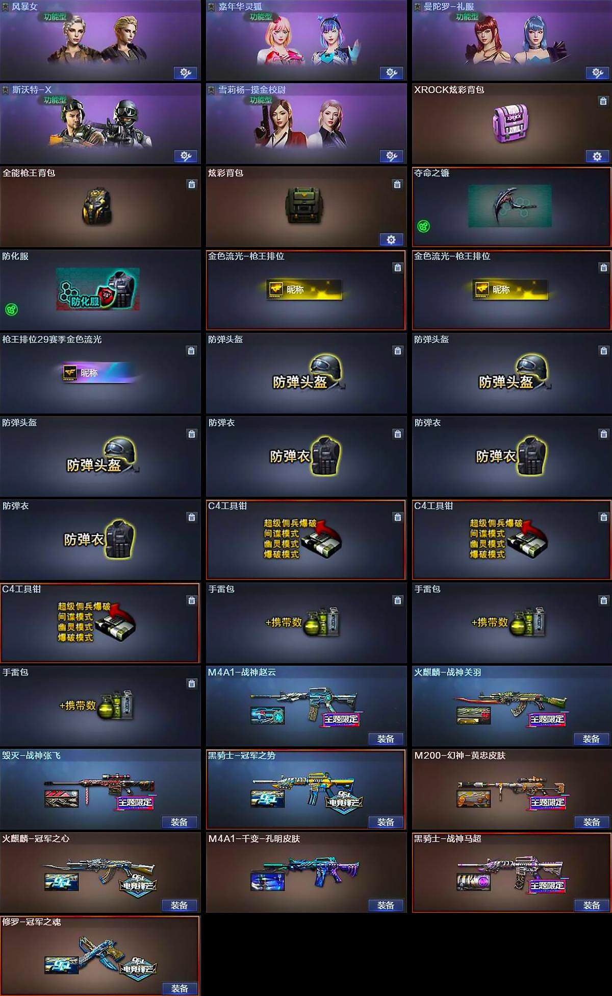 【道具】:XROCK炫彩背包,全能枪王背包,炫彩背包,夺命之镰,防化服,金色流光-枪王排位*2,枪王排位29赛季金色流光,防弹头盔*3,防弹衣*3,C4工具钳*3,手雷包*3