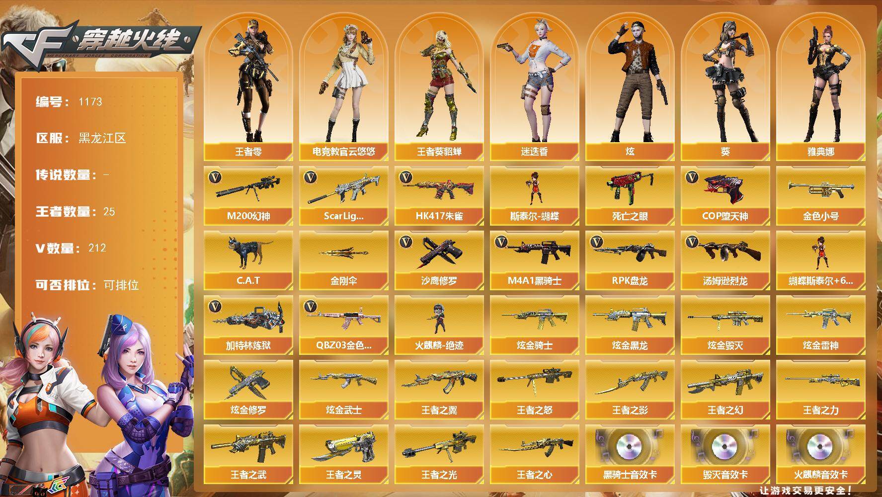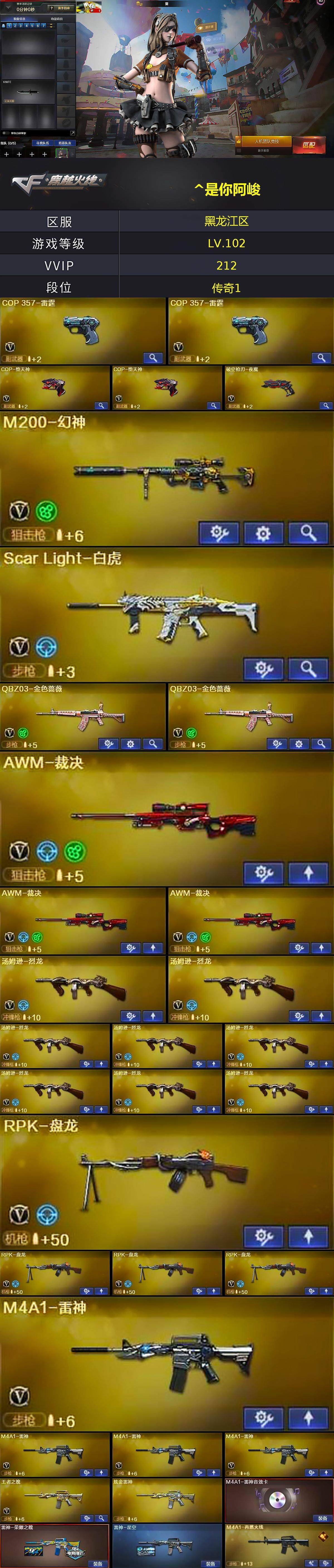 [14985896]黑龙江区-212V-25王者-9炫金 【热门武器】:QBZ03-金色蔷薇*2,Scar Light-白虎,HK417-朱雀,M200-幻神,死亡之眼*2,金色小号,C.A.T,M4A1-黑骑士*3,汤姆逊-烈龙*8,RPK-盘龙*4,加特林-炼狱*6,斯泰尔-蝴蝶,火麒麟-绝迹,COP-堕天神*2,沙鹰-修罗*6,金刚伞 【王者炫金武器】:王者之幻,王者之翼,王者之武,王者之影,王者之心,王者